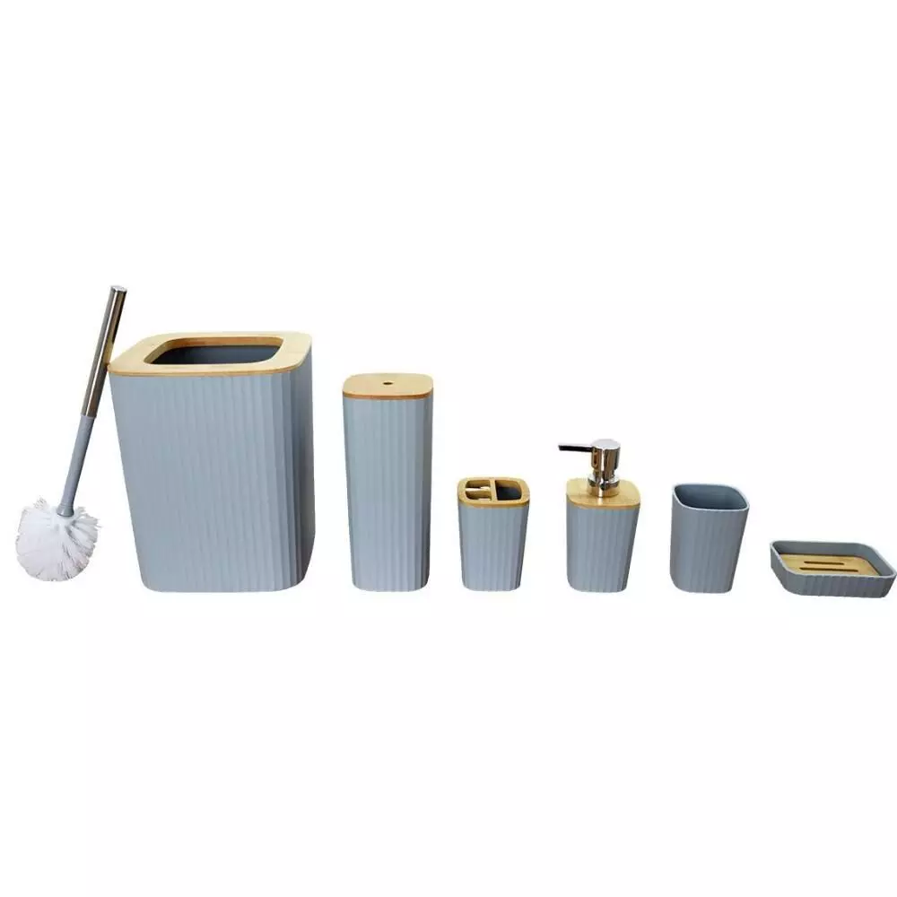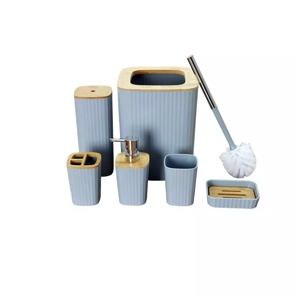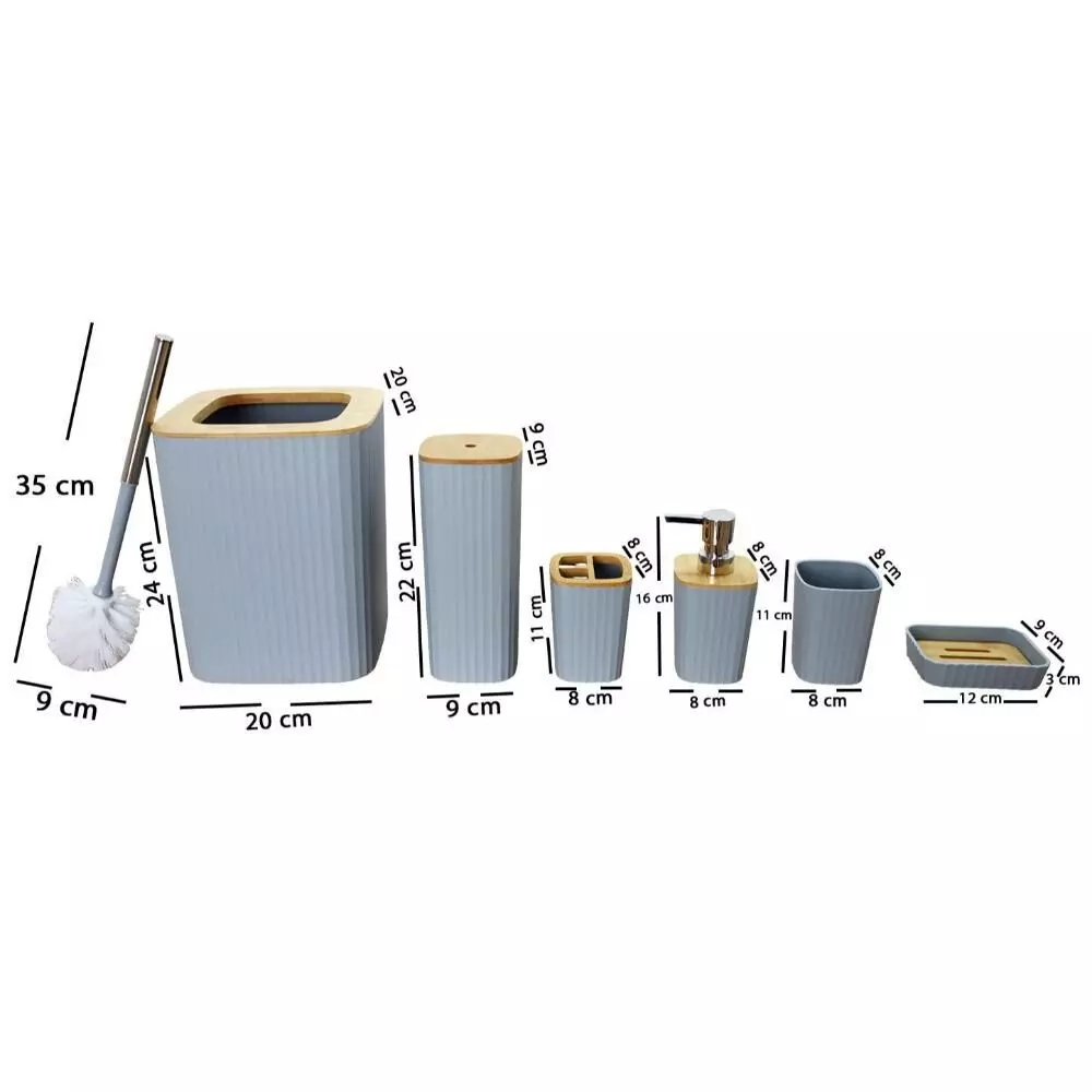 | يتضمن الطقم | موزع صابون - حامل صابون - حامل فرش الأسنان - كوب للشطف - فراشات تنظيف المرحاض - سلة للمهملات |