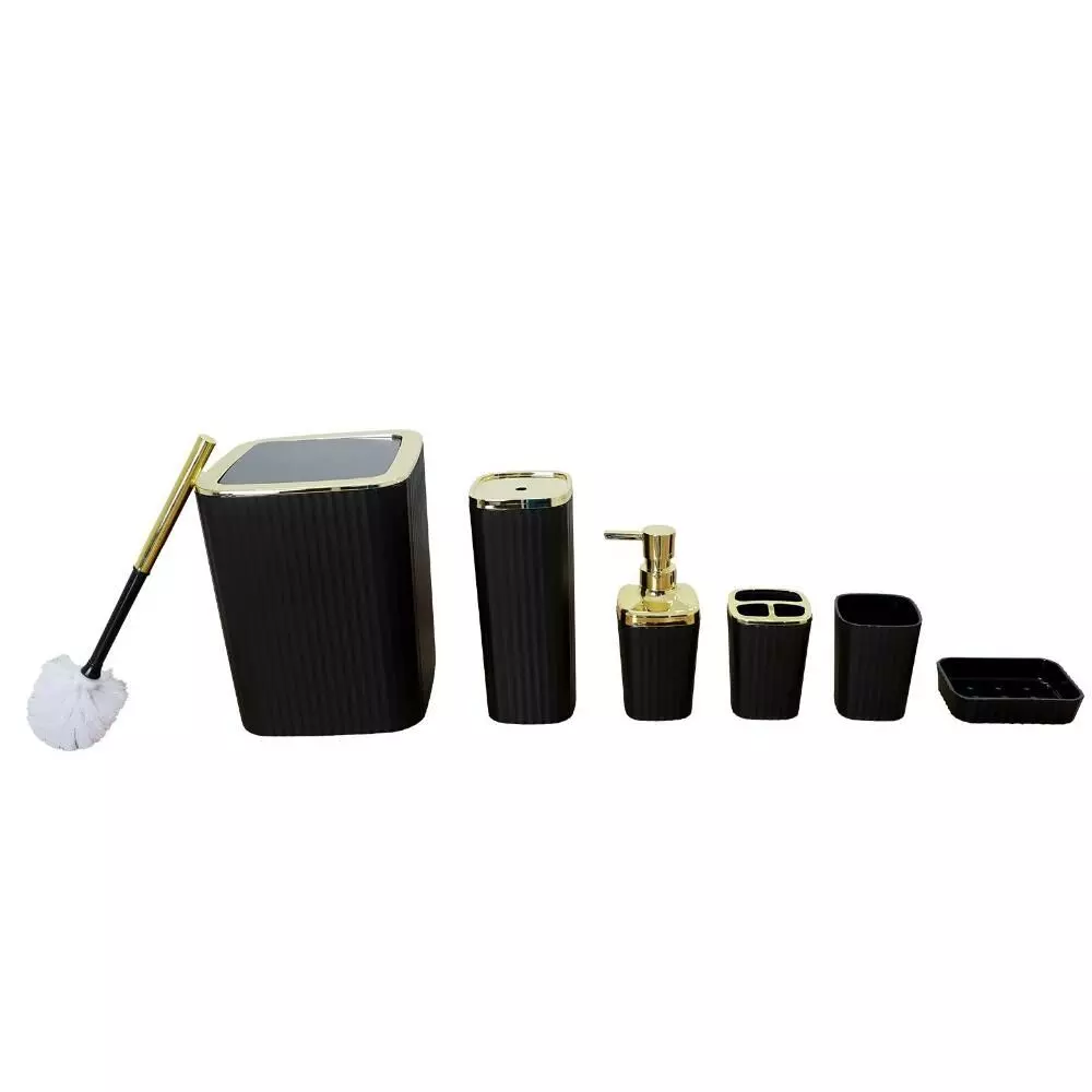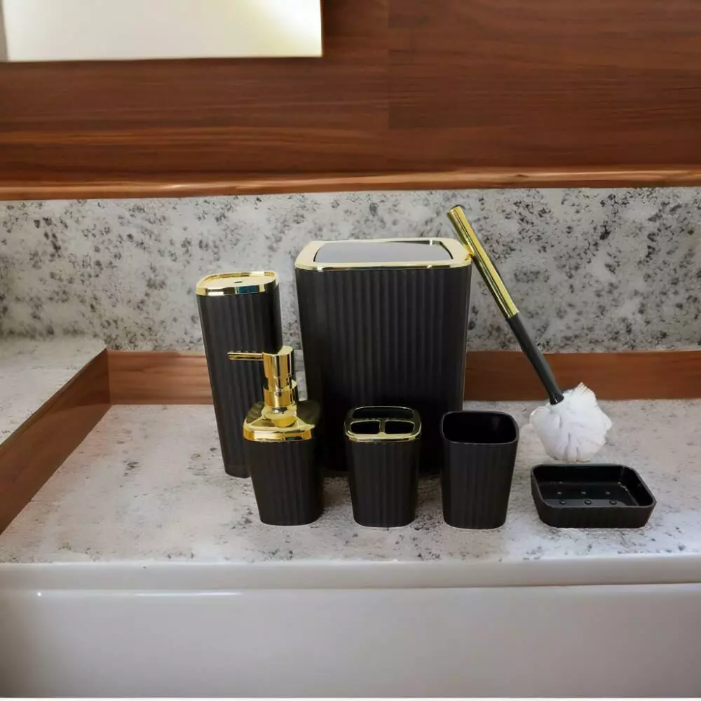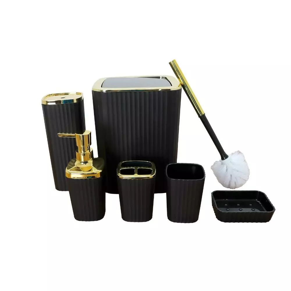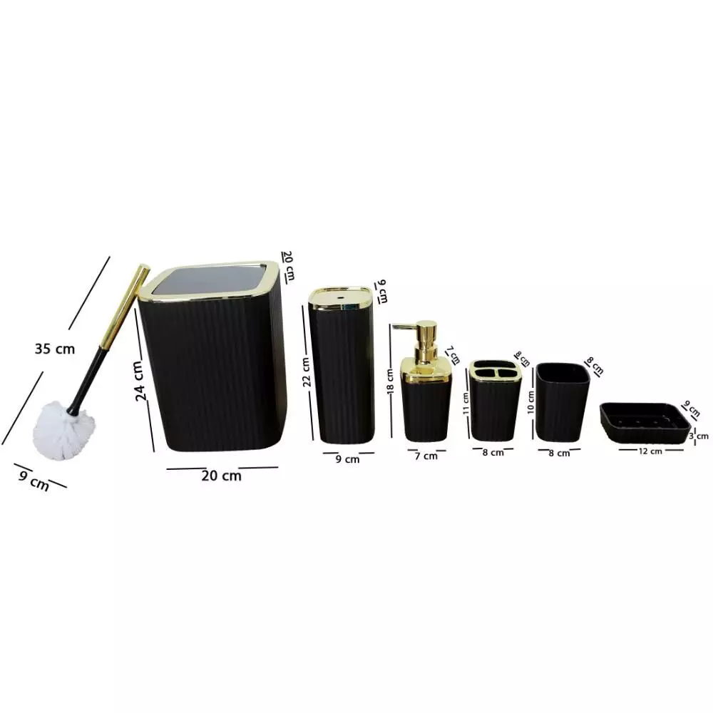| يتضمن الطقم | موزع صابون - حامل صابون - حامل فرش الأسنان - كوب للشطف - فراشات تنظيف المرحاض - سلة للمهملات |
