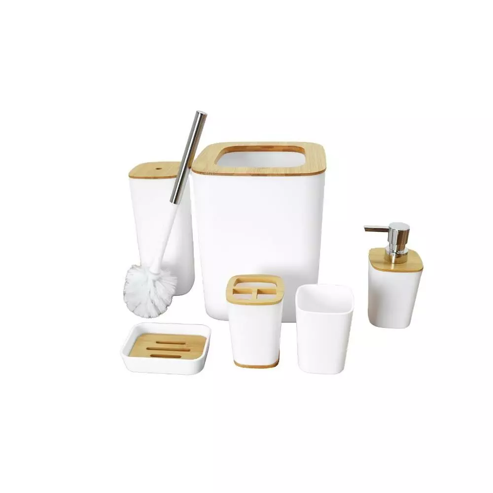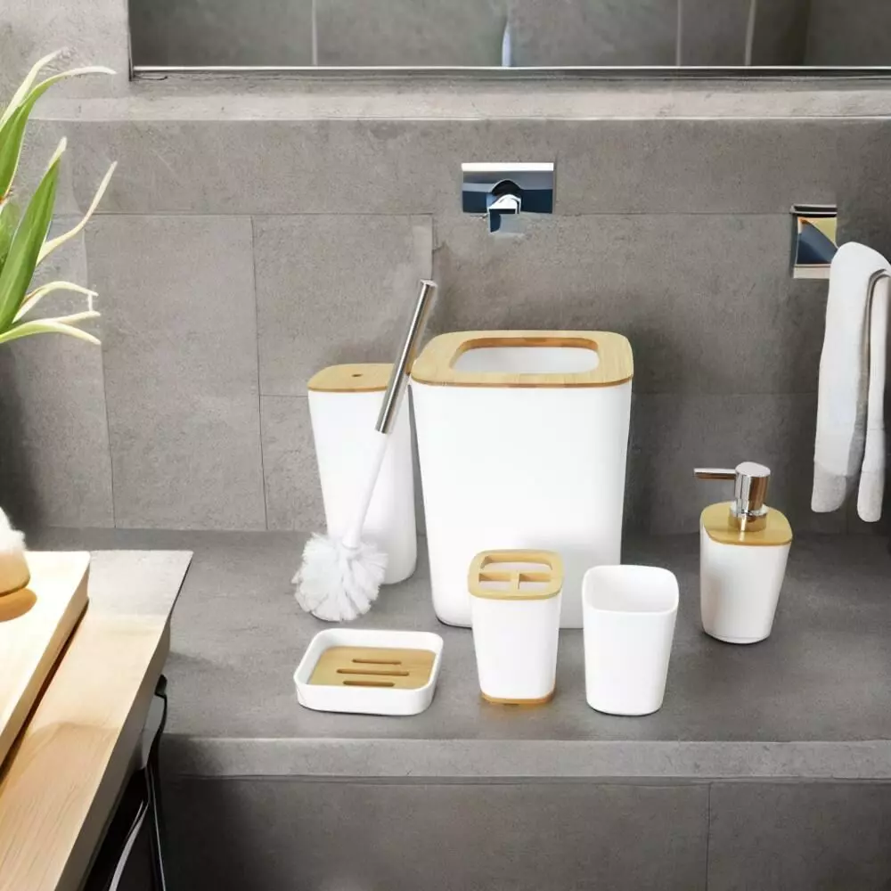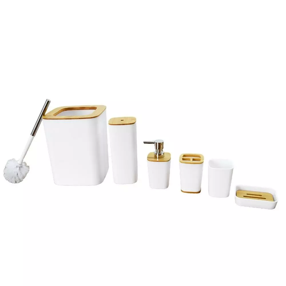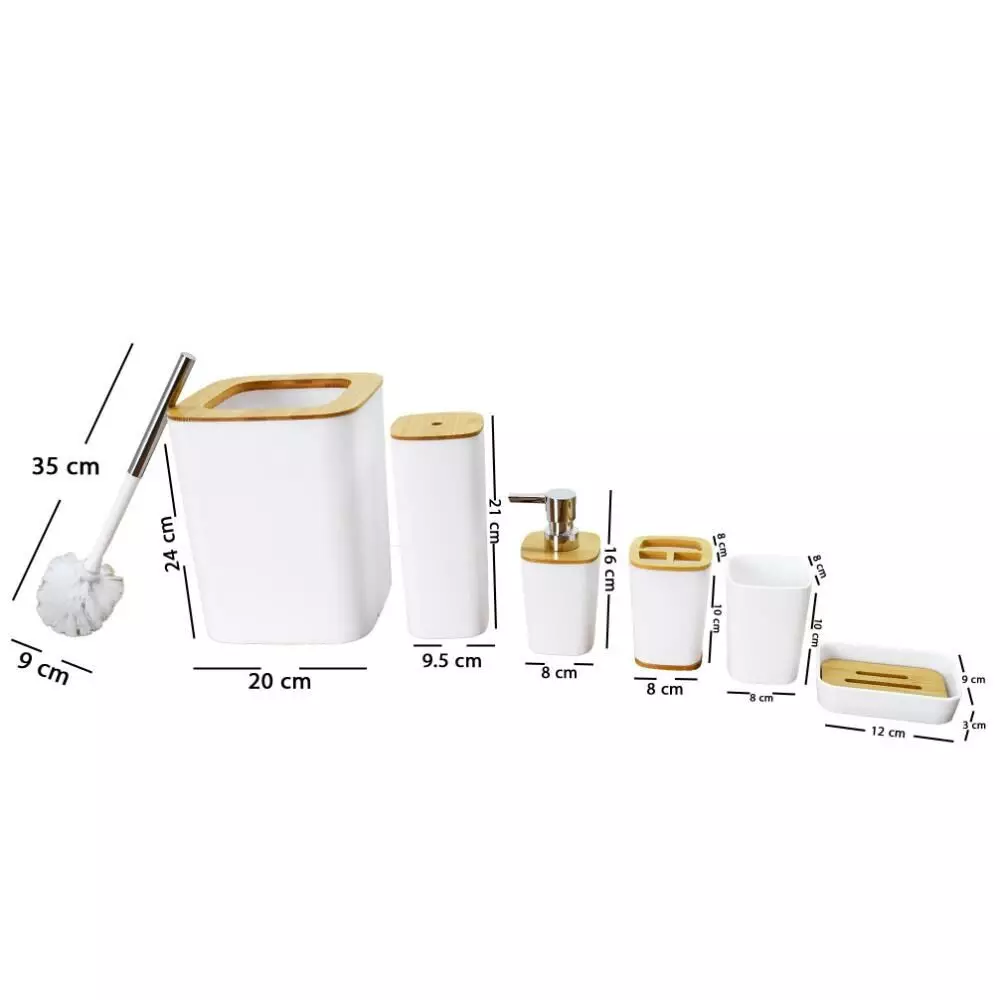 | يتضمن الطقم | موزع صابون - حامل صابون - حامل فرش الأسنان - كوب للشطف - فراشات تنظيف المرحاض - سلة للمهملات |