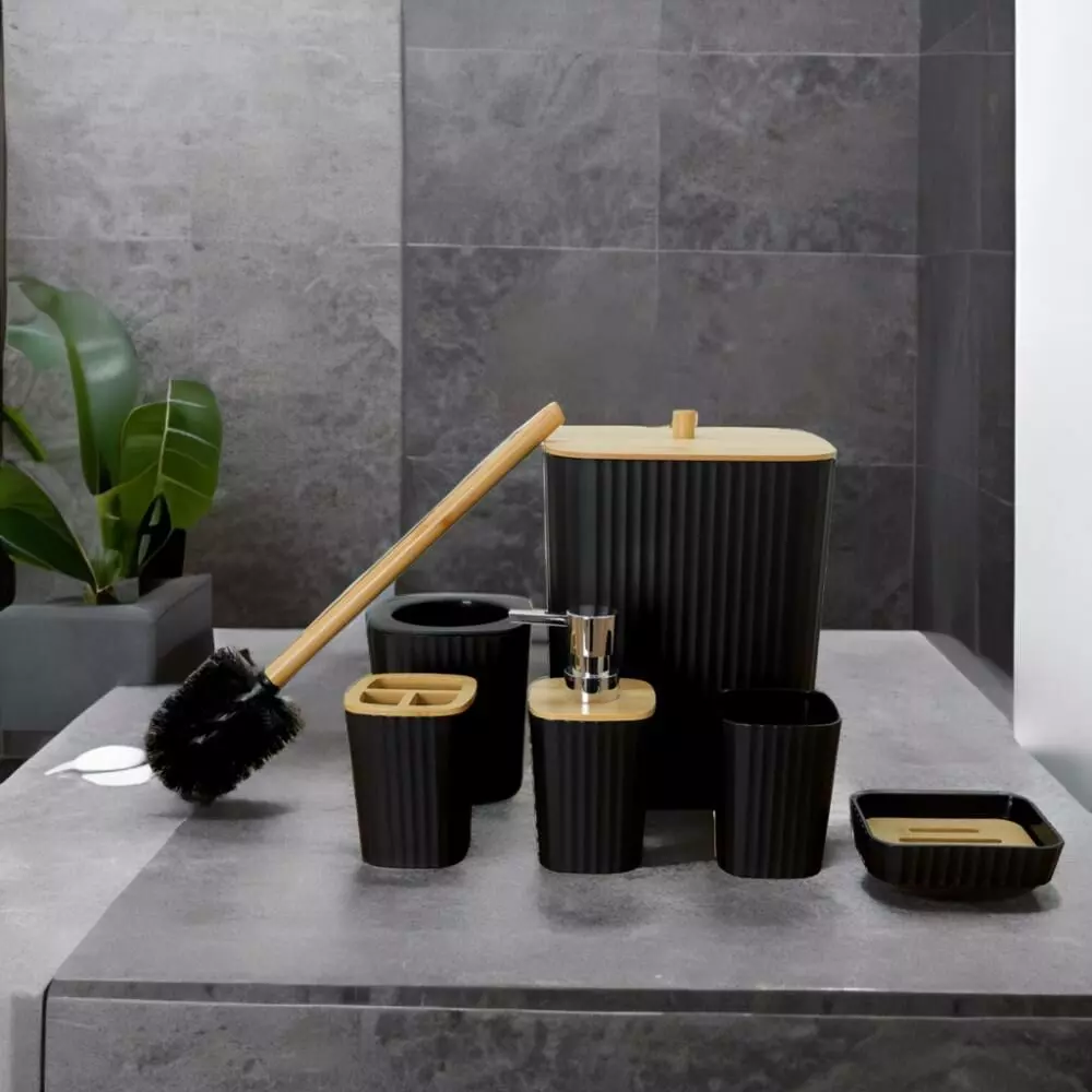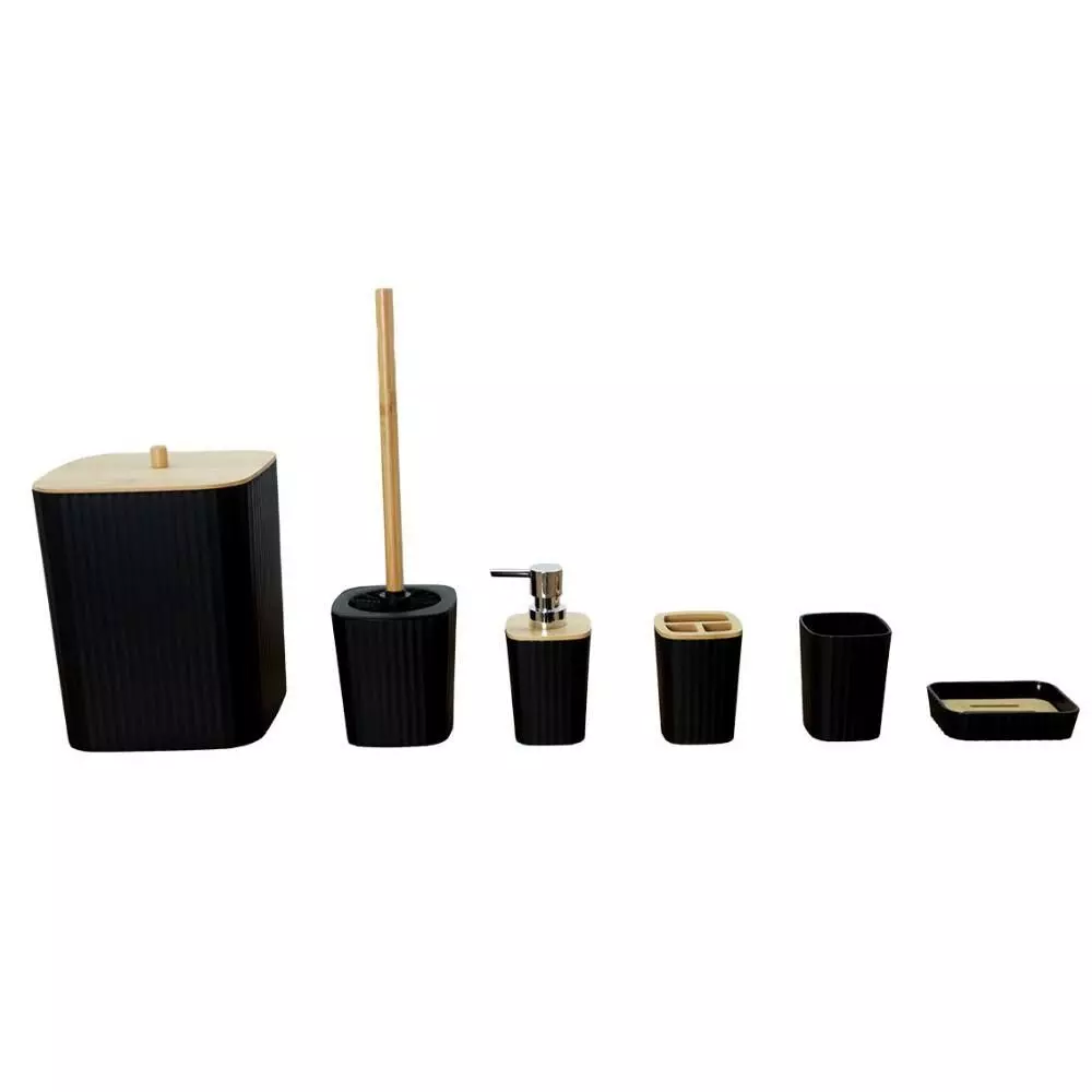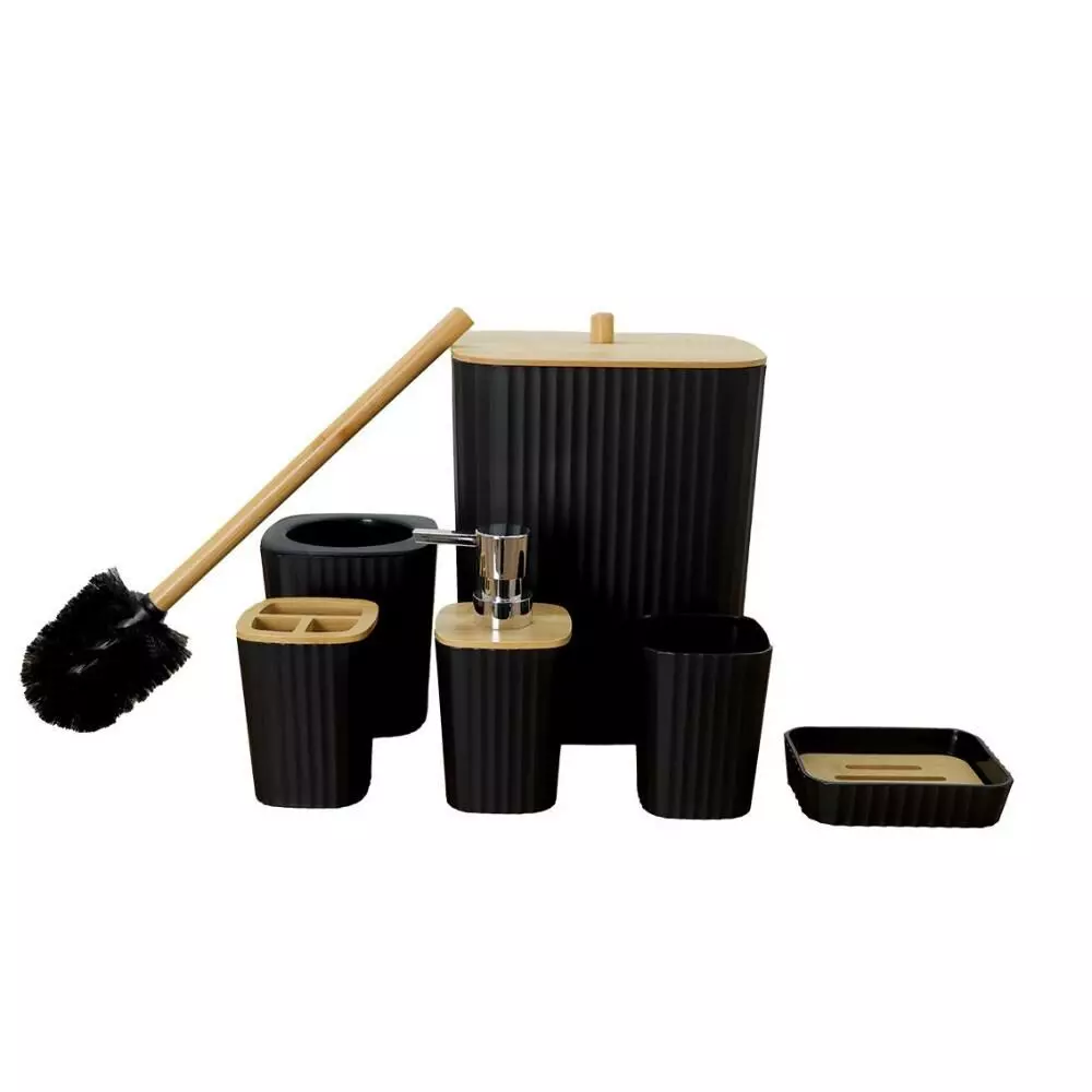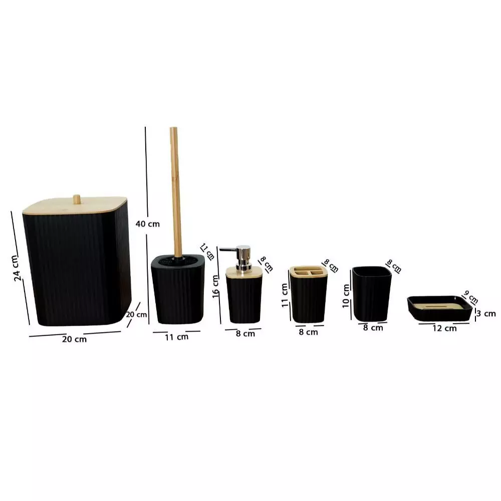 | يتضمن الطقم | موزع صابون - حامل صابون - حامل فرش الأسنان - كوب للشطف - فراشات تنظيف المرحاض - سلة للمهملات |