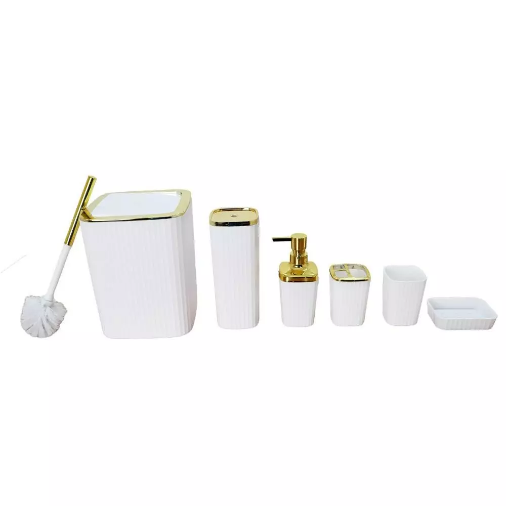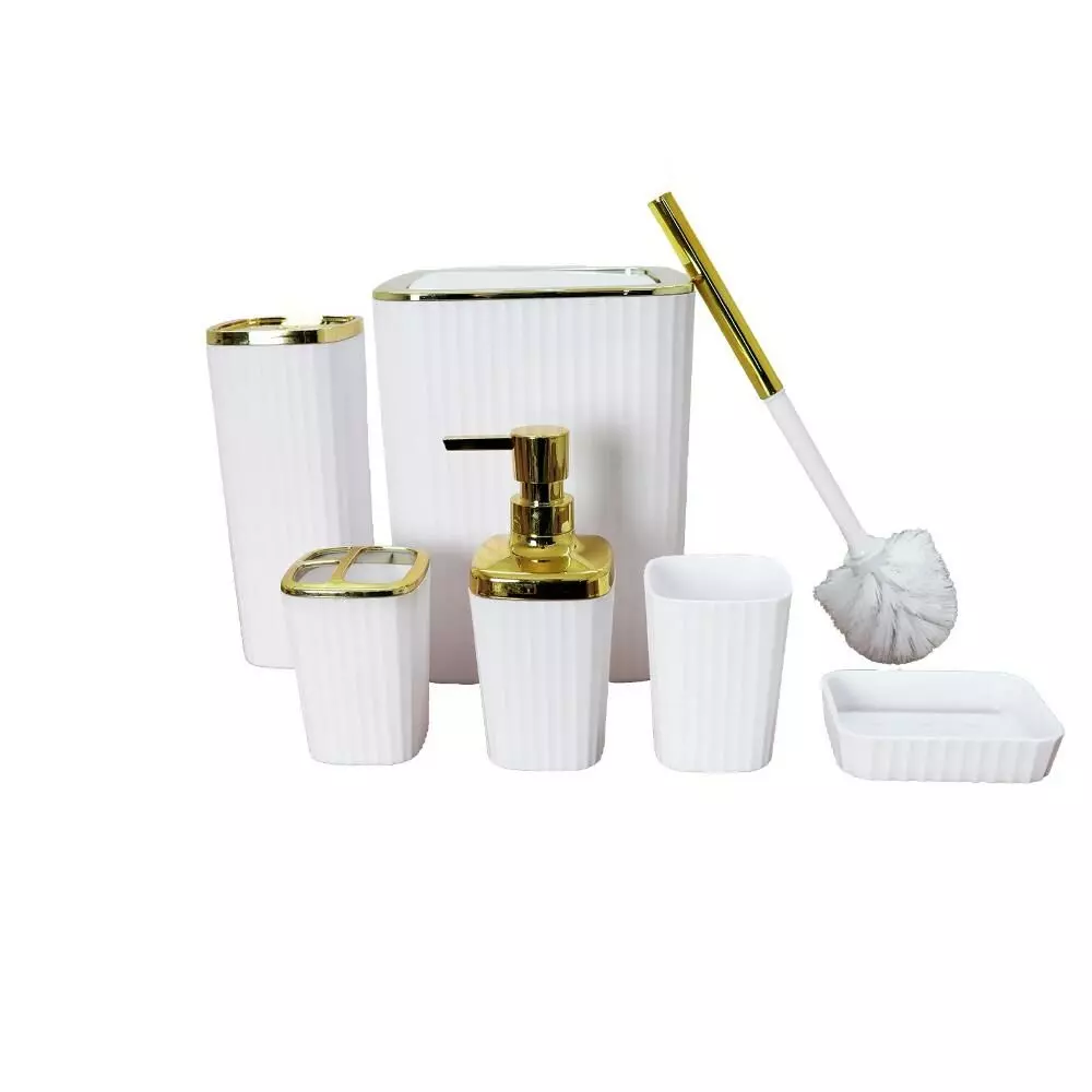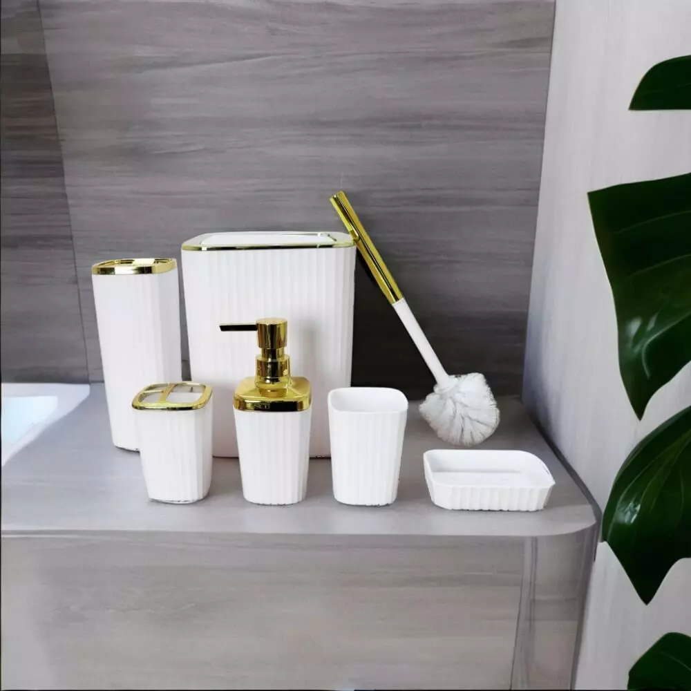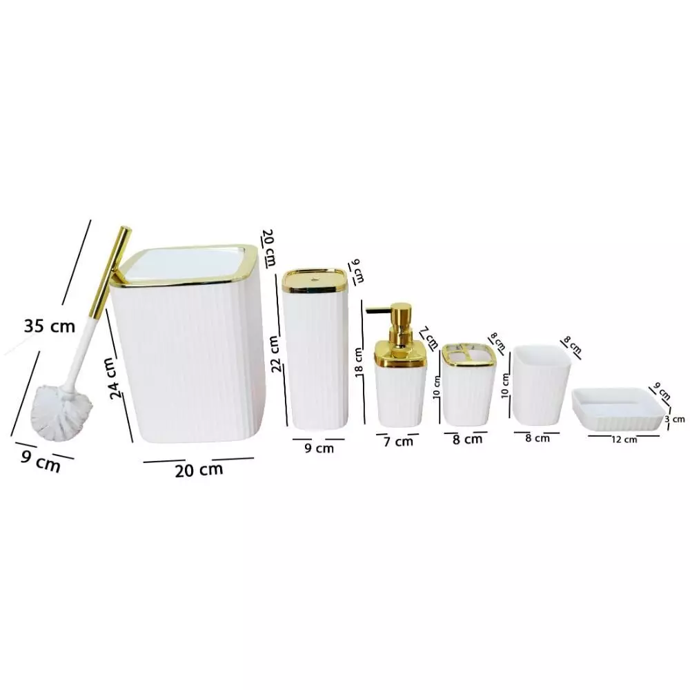 | يتضمن الطقم | موزع صابون - حامل صابون - حامل فرش الأسنان - كوب للشطف - فراشات تنظيف المرحاض - سلة للمهملات |