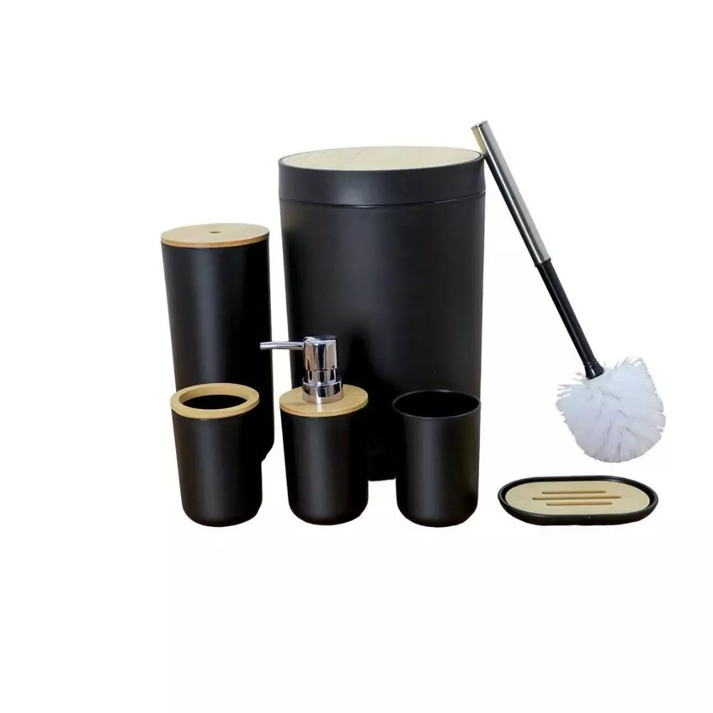 يتضمن الطقم موزع صابون - حامل صابون - حامل فرش الأسنان - كوب للشطف - فراشات تنظيف المرحاض - سلة للمهملات