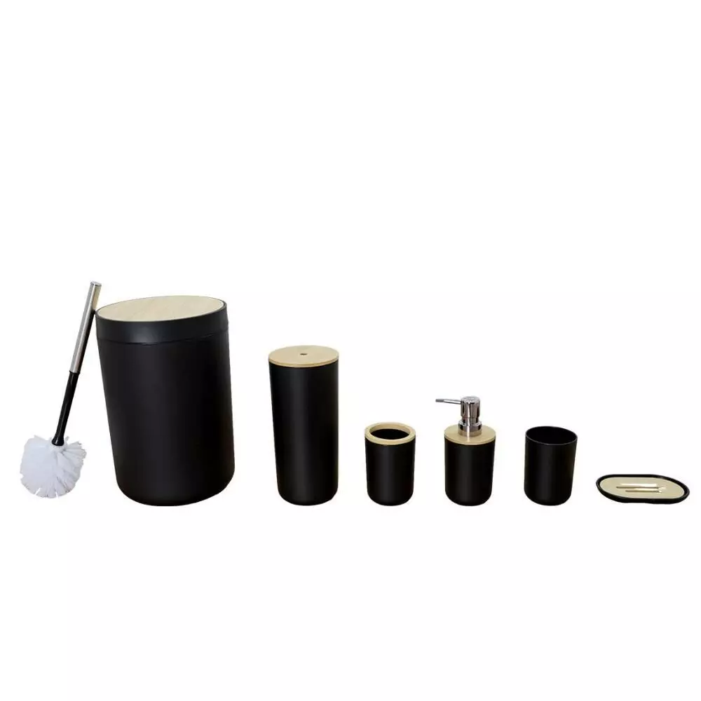 طقم اكسسوار حمام 6 قطع دائري اللون أسود وبيج يتكون الطقم من موزع صابون - حامل صابون - حامل فرش الأسنان - كوب للشطف - فراشات تنظيف المرحاض - سلة للمهملات