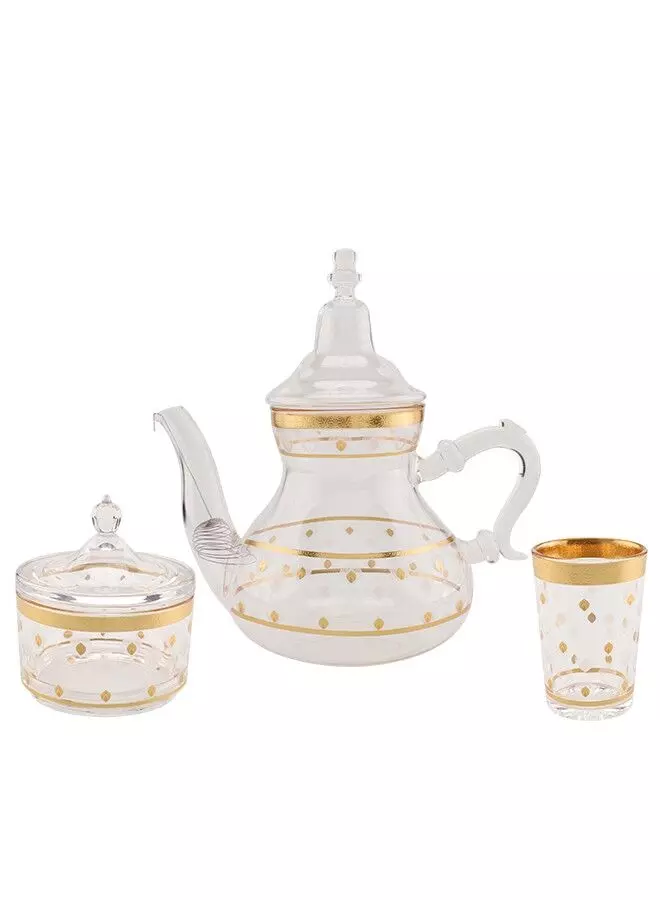 | يتضمن الطقم | 1 قطعة إبريق شاي بغطاء 1400 مل، 6 قطع كاسات200 مل، 1 قطعة سكرية بغطاء 340 مل |
