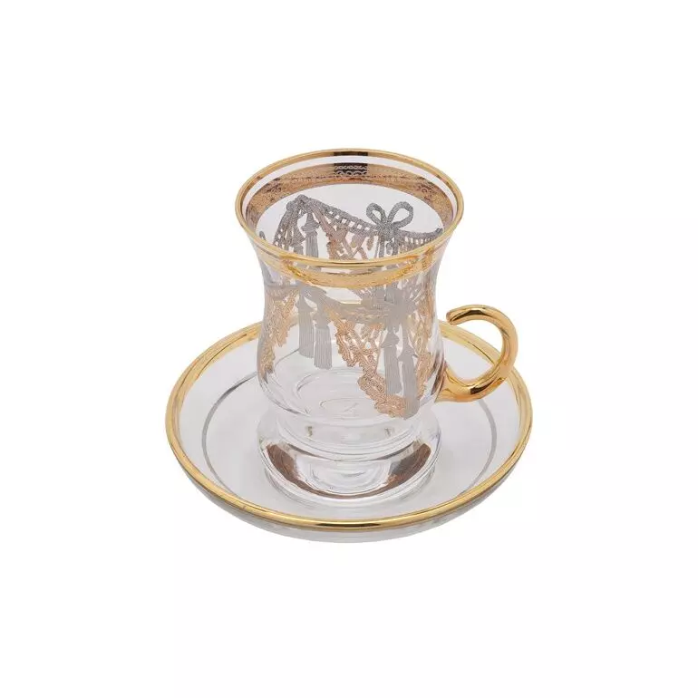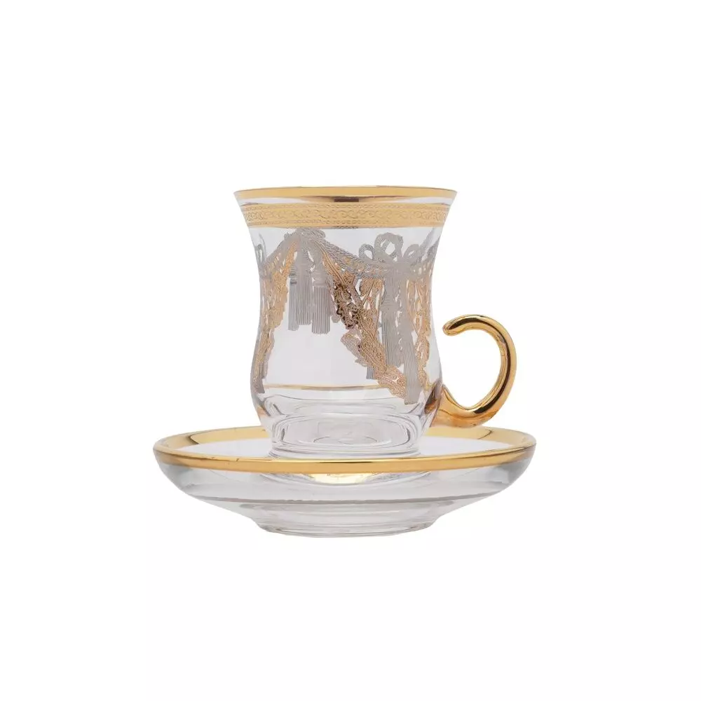 طقم من 6 فناجين شاي مصنوعة من الزجاج مزينة بنقوش ذهبية وفضية, مثالية للإستخدام اليومي أو للضيافة.