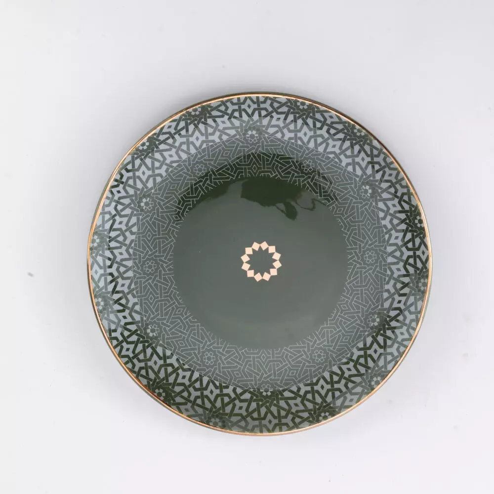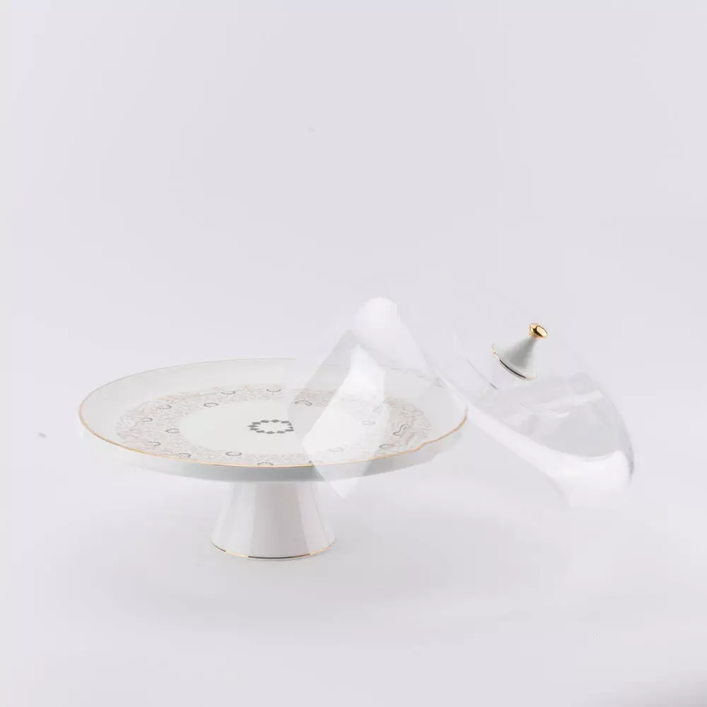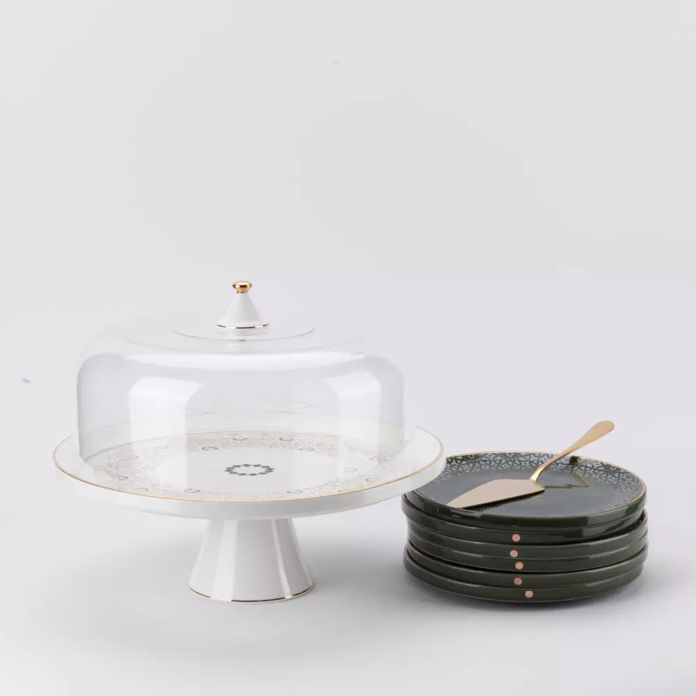 طقم تقديم الكيك من أثير باللون الزيتي والذهبي مصنوع من البورسلين يتكون من 1حامل كيك 1غطاء 6 اطباق تقديم 1 سكينة فقط.