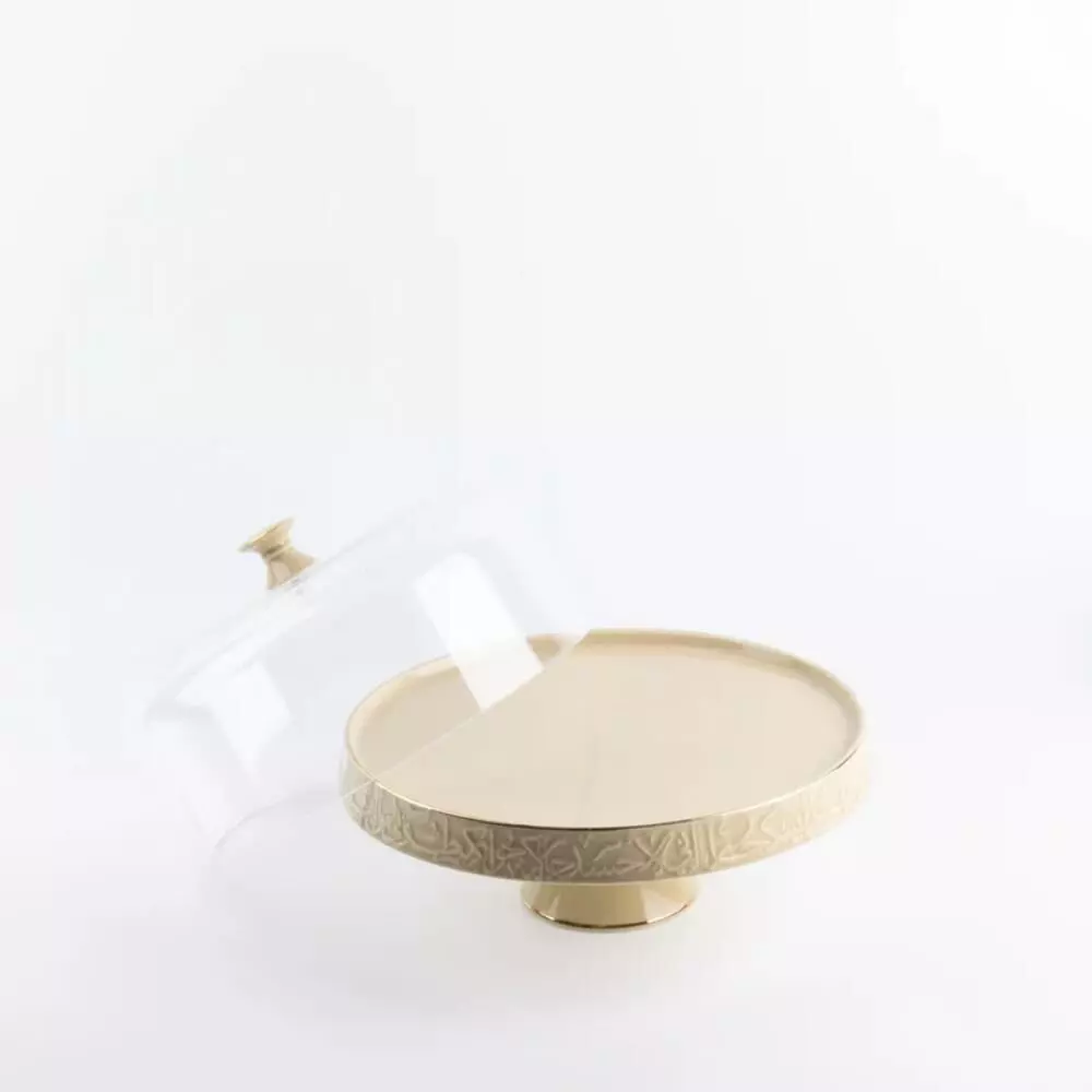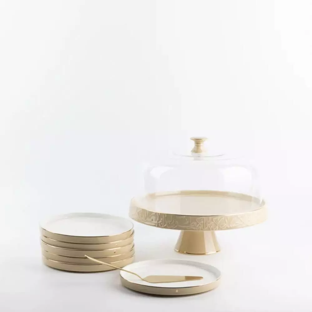 | يتضمن الطقم | 1 حامل كيك - 1 غطاء - 6 اطباق تقديم - 1 سكينة لتقطيع وحمل للكيك |