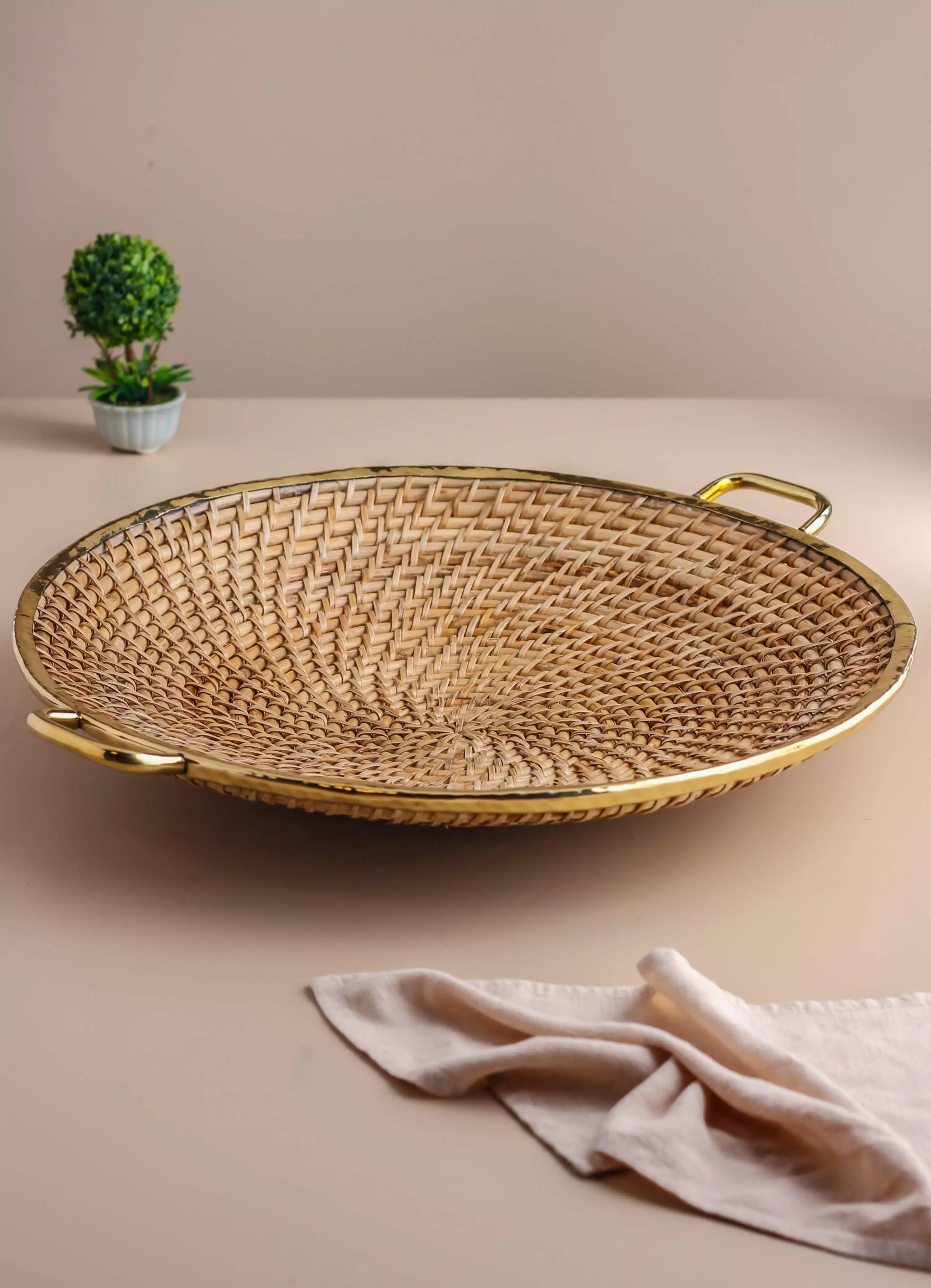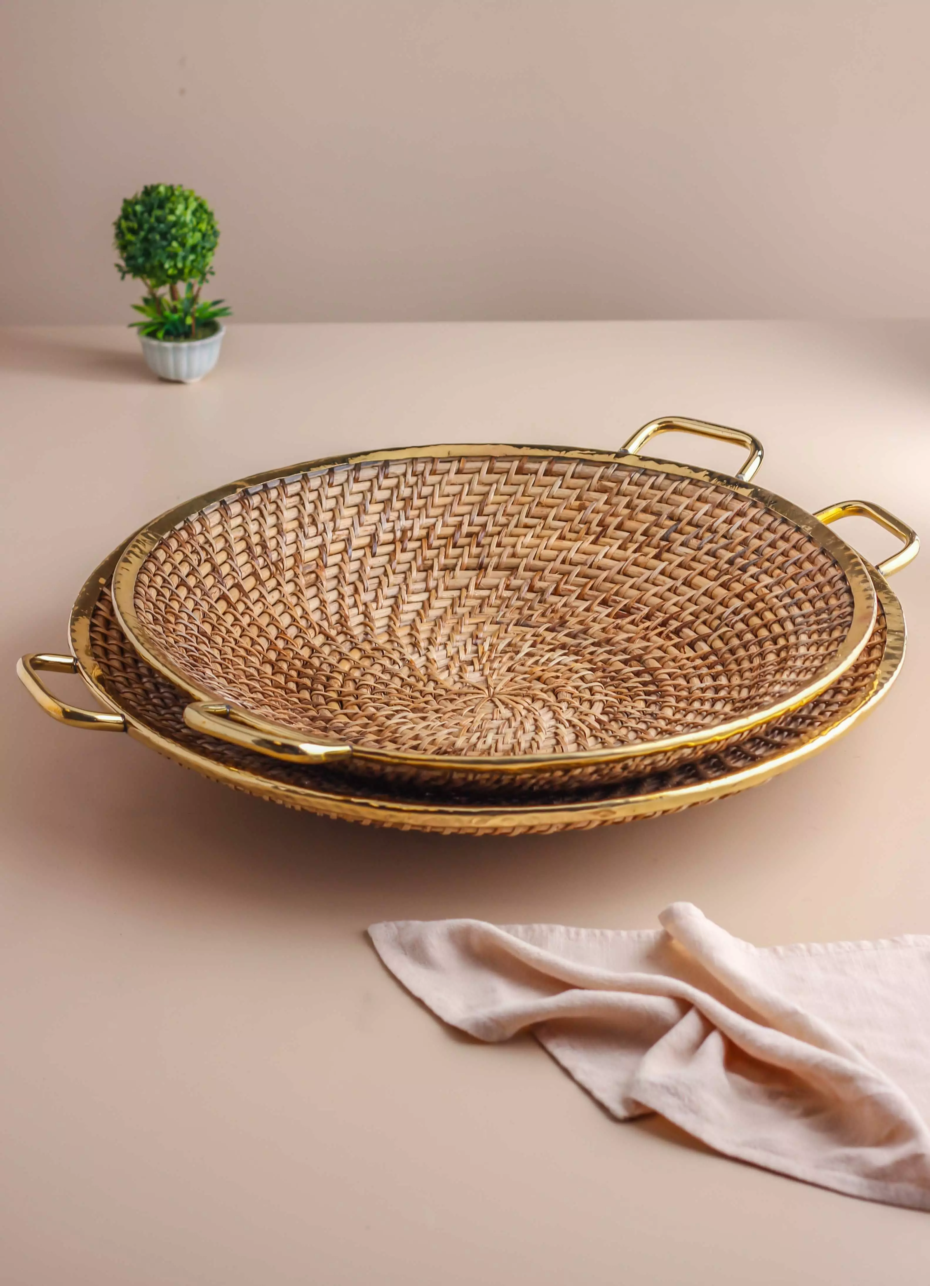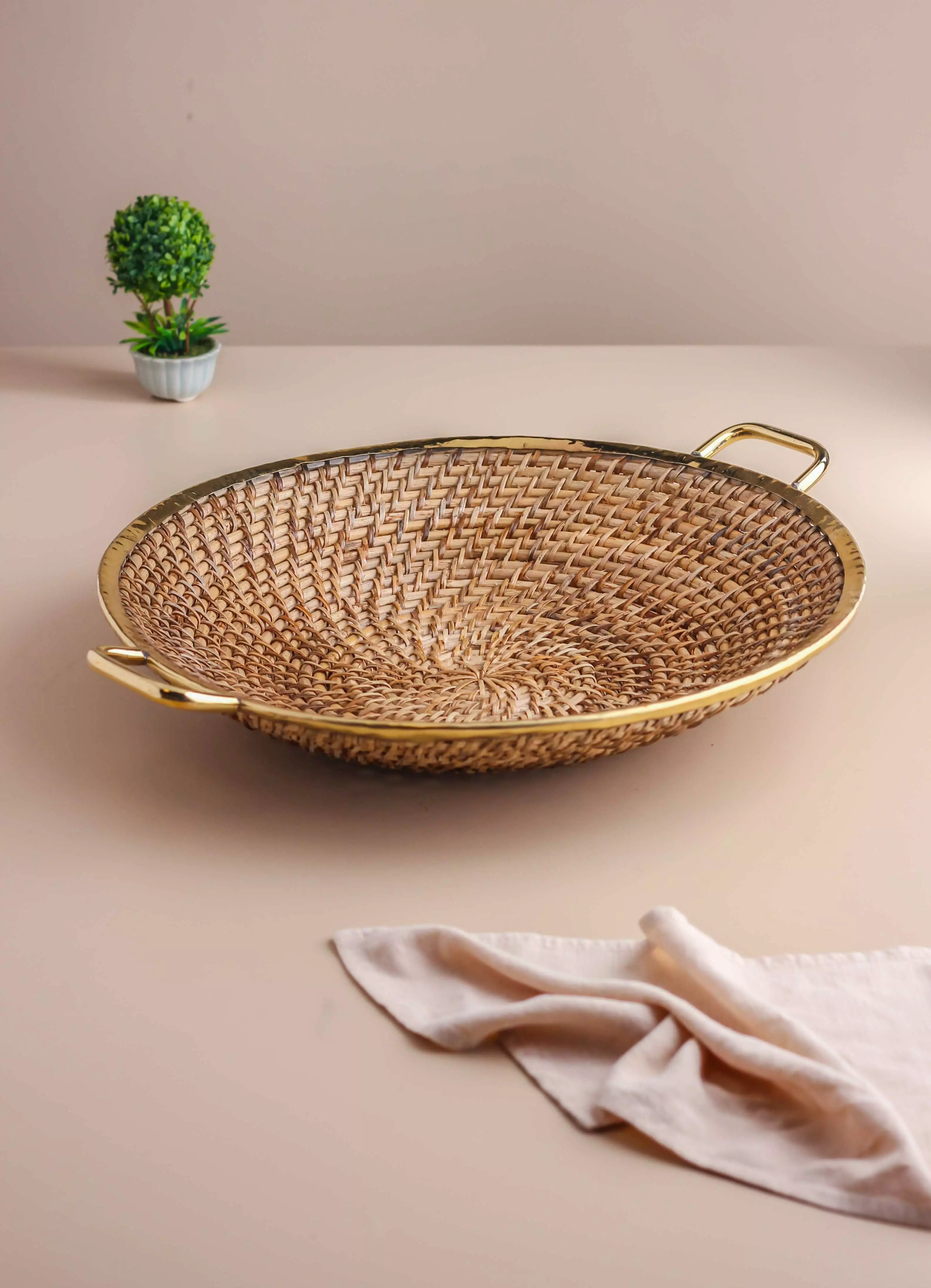السلال محبوكة من الخسف عالي الجودة يدوياً وبحرفية عالية بلون السلال التقليدي مع حواف باللون الذهبي ومقبضين يسهلان حمل السلة.