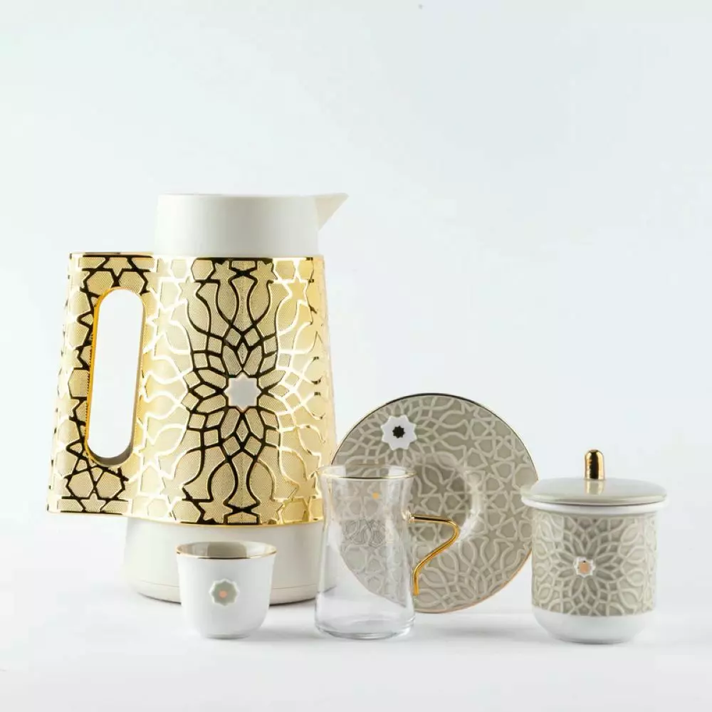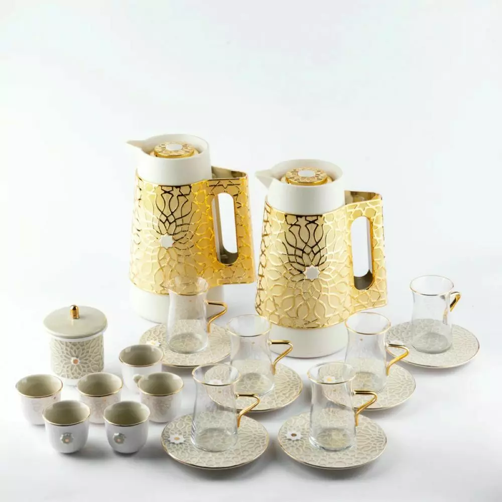 | يتضمن الطقم | 6 بيالة شاي و6 صحون و6 فناجين قهوة عربية وسكرية و 2 ترمس للشاي والقهوة |