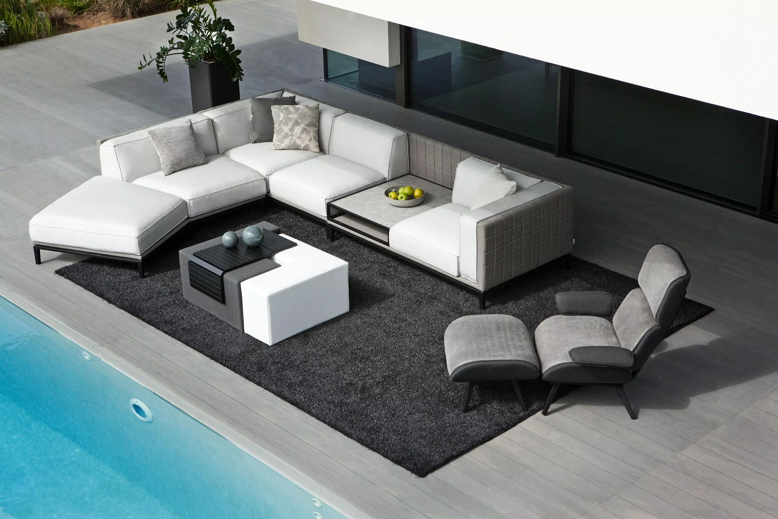 المواد: قماش سنبرلا والألمنيوم تتكون من:كنبة بمقعد و طاولة جهة اليسار - طول 176 سم عرض 98 سم ارتفاع 71 سم -كنبة بمقعدين زاوية يمين - طول 176 سم عرض 98 سم ارتفاع 71 سم - كرسي استرخاء طول 198 سم عرض 122 سم ارتفاع 71 سم - طاولة بانورامية للكنب طول 74.5 سم عرض 99.5 سم ارتفاع 42 سم - صينية متحركة فتحة من الألومنيوم - طول 64 عرض 64 ارتفاع 46 سم