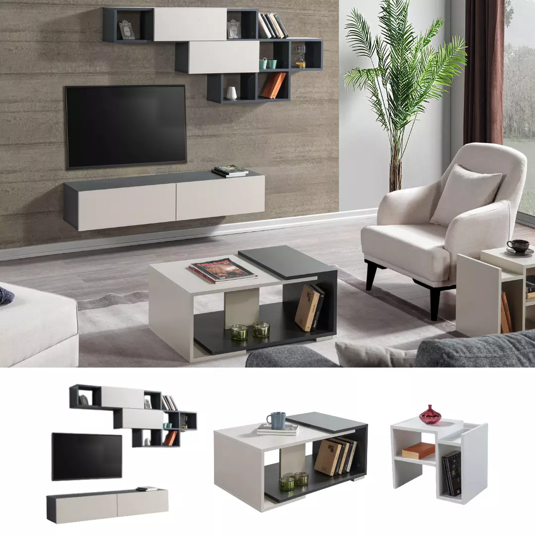 | يتضمن الطقم | عدد 1 طاولة تلفزيون مع وحدة رفوف جدارية أريستو أنتراسيت إلم كوڤ - رمادي فاتح واسود , عدد 1 طاولة قهوة لينتون إلم كوڤ - رمادي غامق ورمادي فاتح , عدد 1 طاولة جانبية بيلون إلم كوف - ابيض |