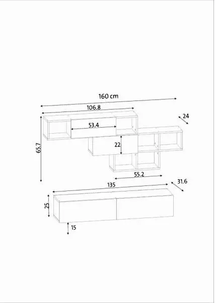 | أبعاد المنتج | ابعاد طاولة التلفزيون : العرض 135 سم *الارتفاع 25 سم * العمق 31.6 سم,الرفوف الجدارية : العرض الكلي 160.2 سم *عرض الرف العلوي106.8 سم *ارتفاع الرف : 65.7 سم , ابعاد طاولة قهوة: ارتفاع 35 سم * العرض 70 سم *العمق 50 سم , ابعاد طاولة جانبية : ارتفاع 40 سم *العرض 49.9 سم العمق 29.5 سم |