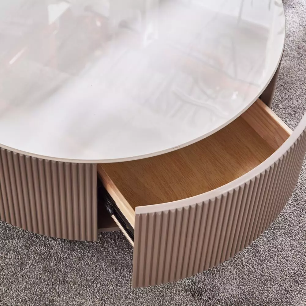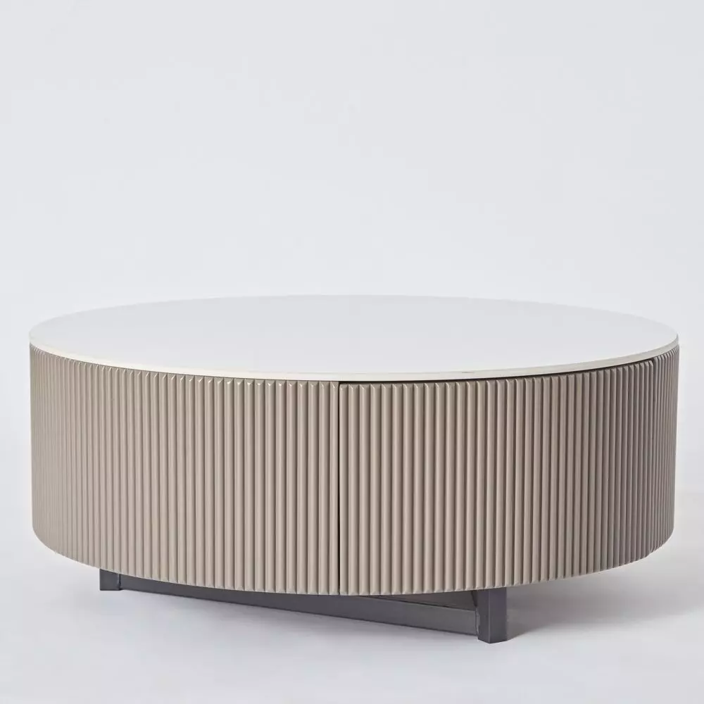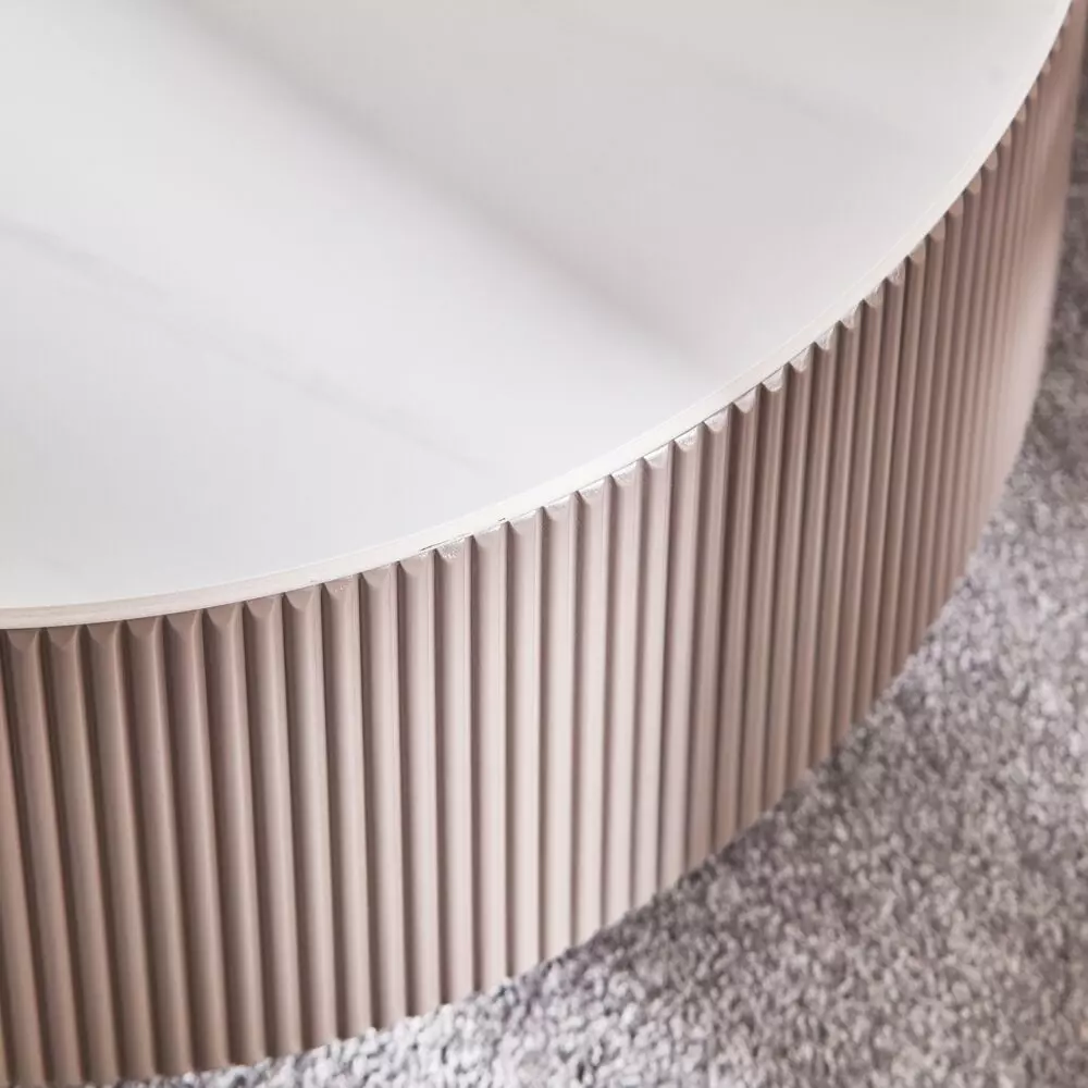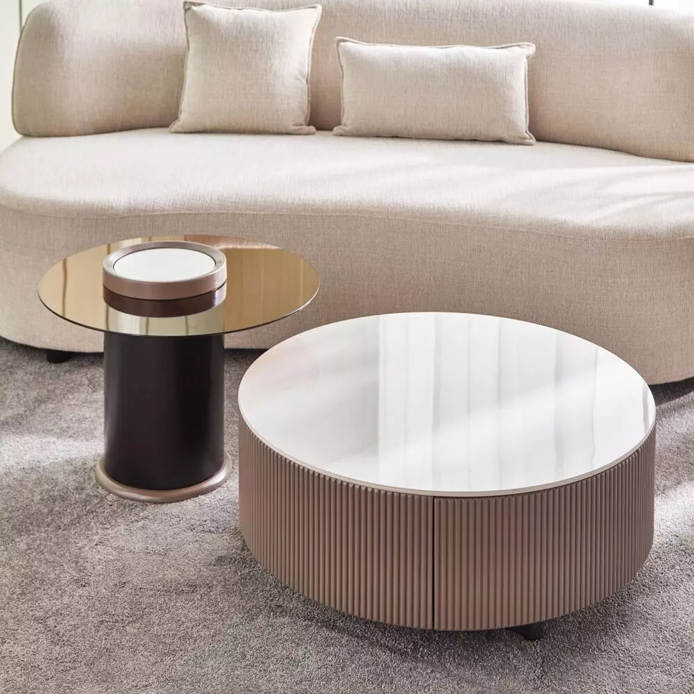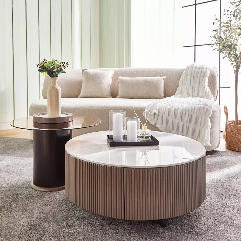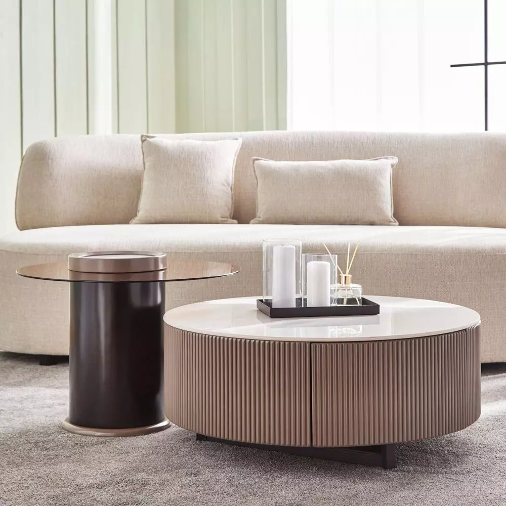 طاولة القهوة القُطر: 80 سم - الوزن: 48 كجم - الارتفاع: 33 سم طاولة جانبية القُطر: 58 سم - الارتفاع: 47 سم |
