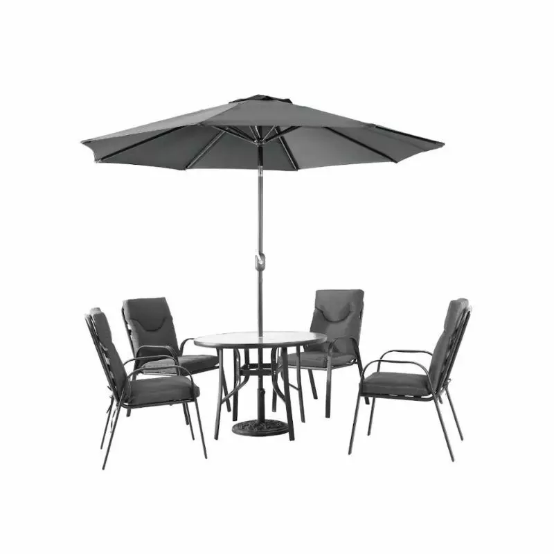 | يتضمن الطقم | 1 طاولة طعام مع مظلة - 4 كراسي |