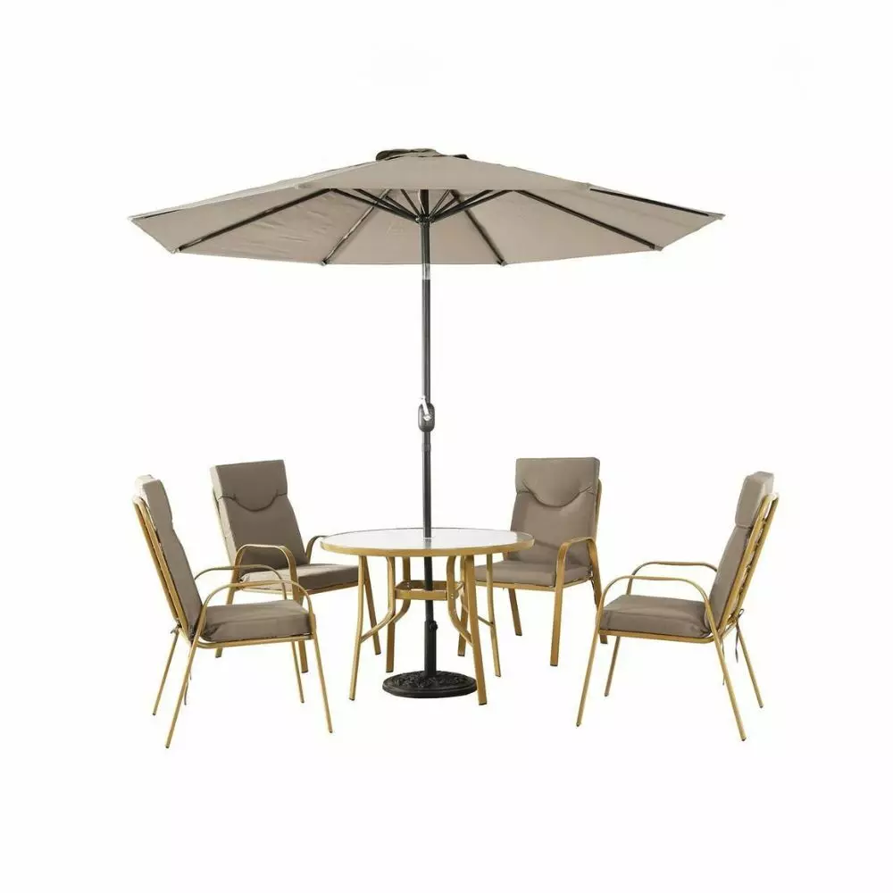 | يتضمن الطقم | 1 طاولة طعام مع مظلة - 4 كراسي |