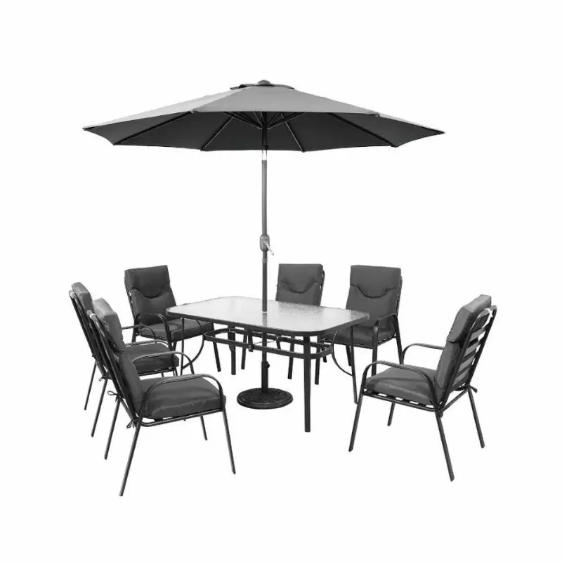 | يتضمن الطقم | 1 طاولة طعام مع مظلة - 6 كراسي |