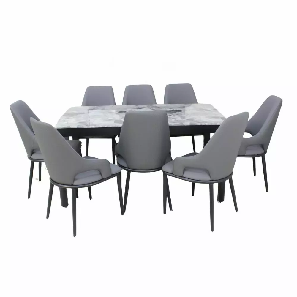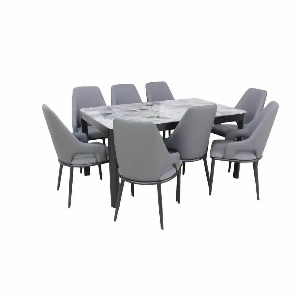 طقم طاولة طعام أنيق وعصري مكون من طاولة مستطيلة وثمانية كراسي بتصميم مريح. صُنع الطقم من حديد وجلد عالي الجودة يمنحك جلوسًا مريحًا لفترات طويلة.