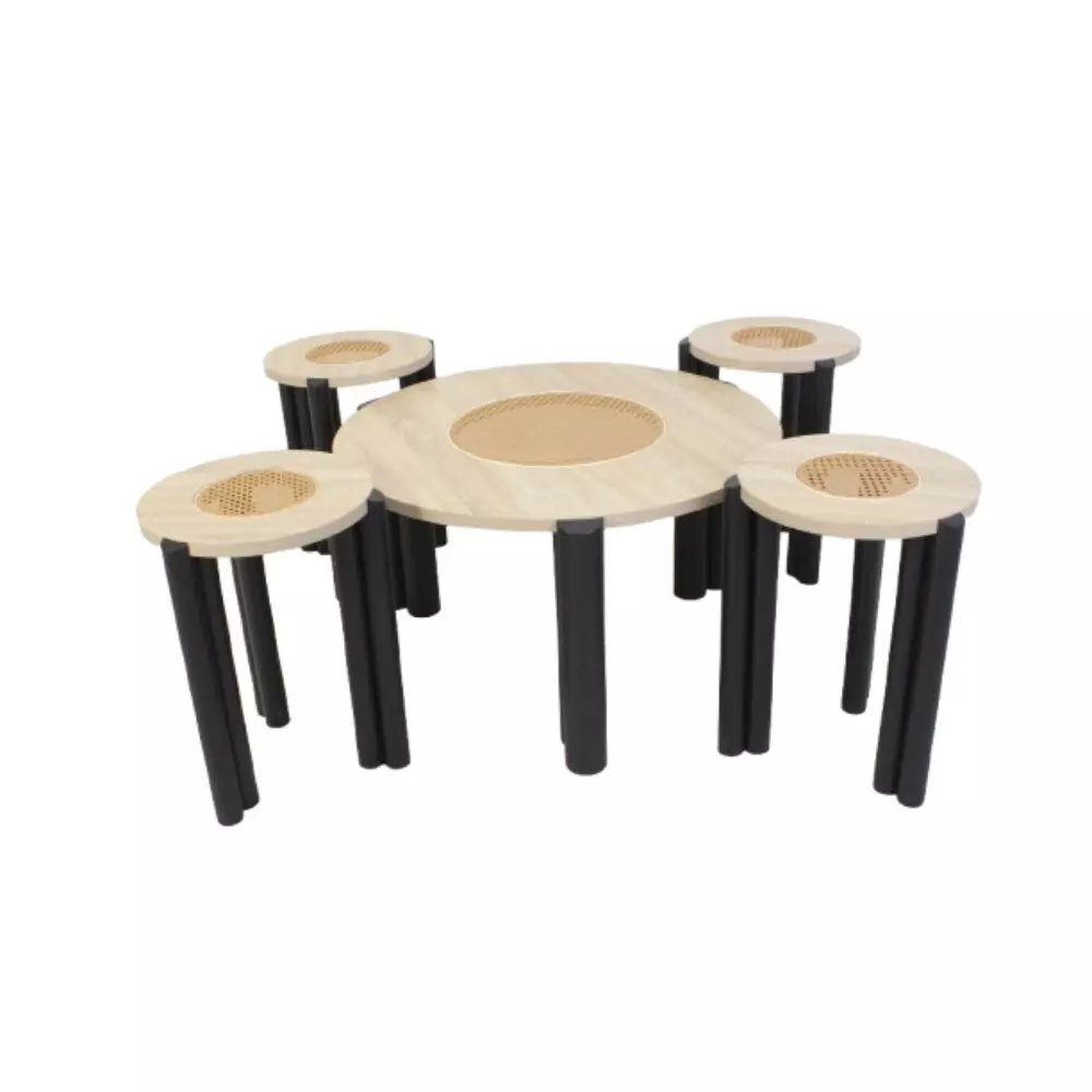 اقتني طقم طاولة القهوة دولار واجمع بين الأناقة والجودة في آن واحد . يتكون الطقم من طاولة قهوة و 4 طاولة جانبية تحقق لك الاستفادة القصوى وتزيد من أناقة منزلك. مصنوع من خشب وراتان وقوائم حديد متينة تضمن لك قوة الطقم.
