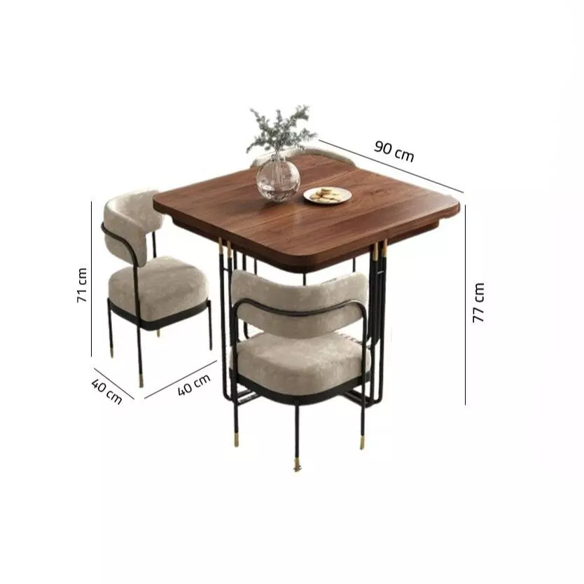 مقاسات الكرسي: الطول 40 سم * العرض 40 سم * الارتفاع 71 سم مقاس الطاولة: السطح العادي: الطول 90 سم * العرض 90 سم * الارتفاع 77 سم - السطح المضاعف: الطول 180 سم * العرض 90 سم * الارتفاع 75 سم |