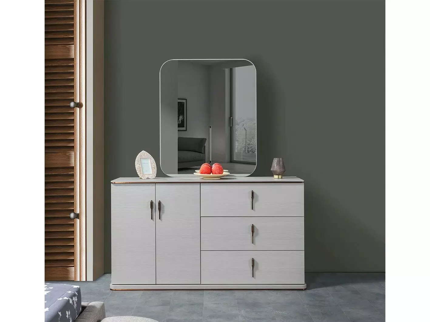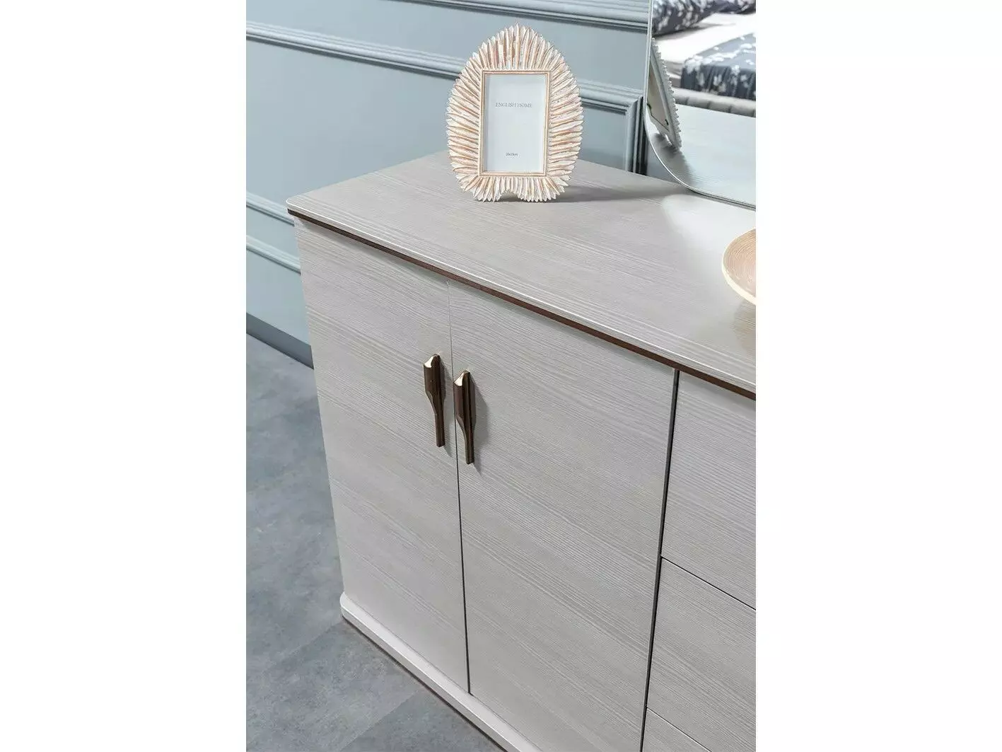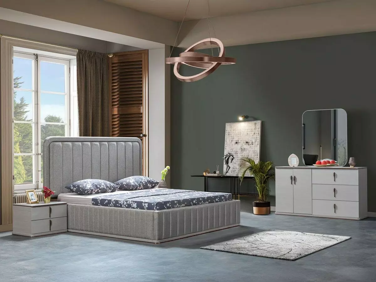 | يتضمن الطقم | سرير مزدوج - طاولة تزيين - مرأة - أدراج ارفف - 2 كومودينو |