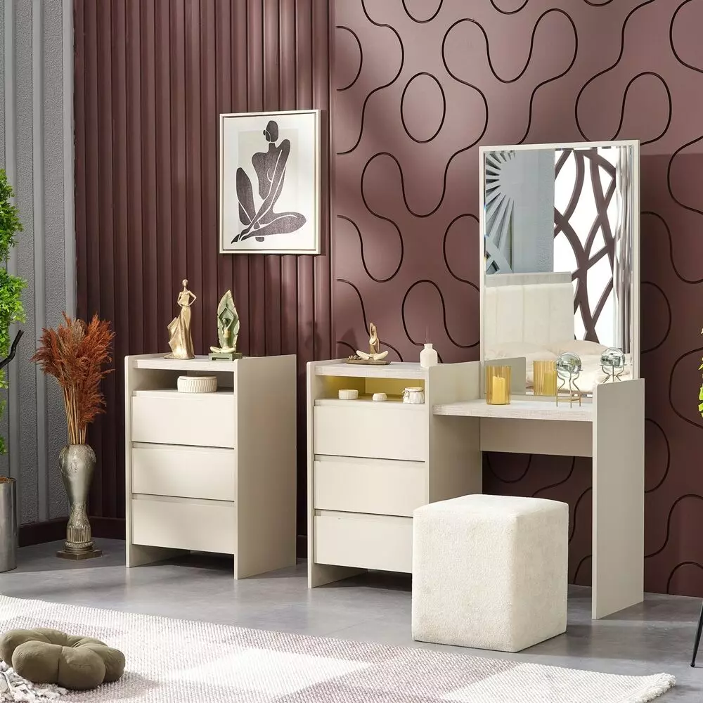 يتضمن الطقم: 1 × سرير كينج، 2 × طاولة سرير جانبية, 1 × طاولة تزيين، 1 × مرآة، 1 × مقعد.