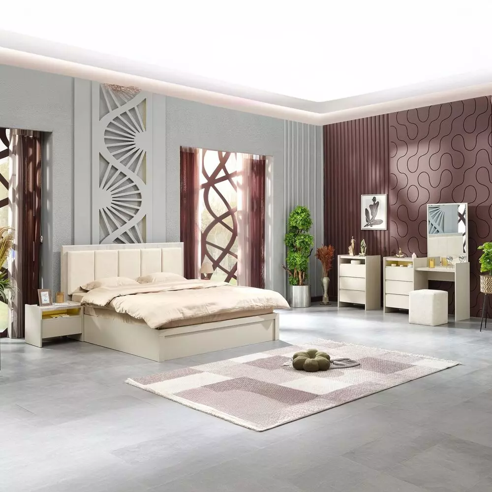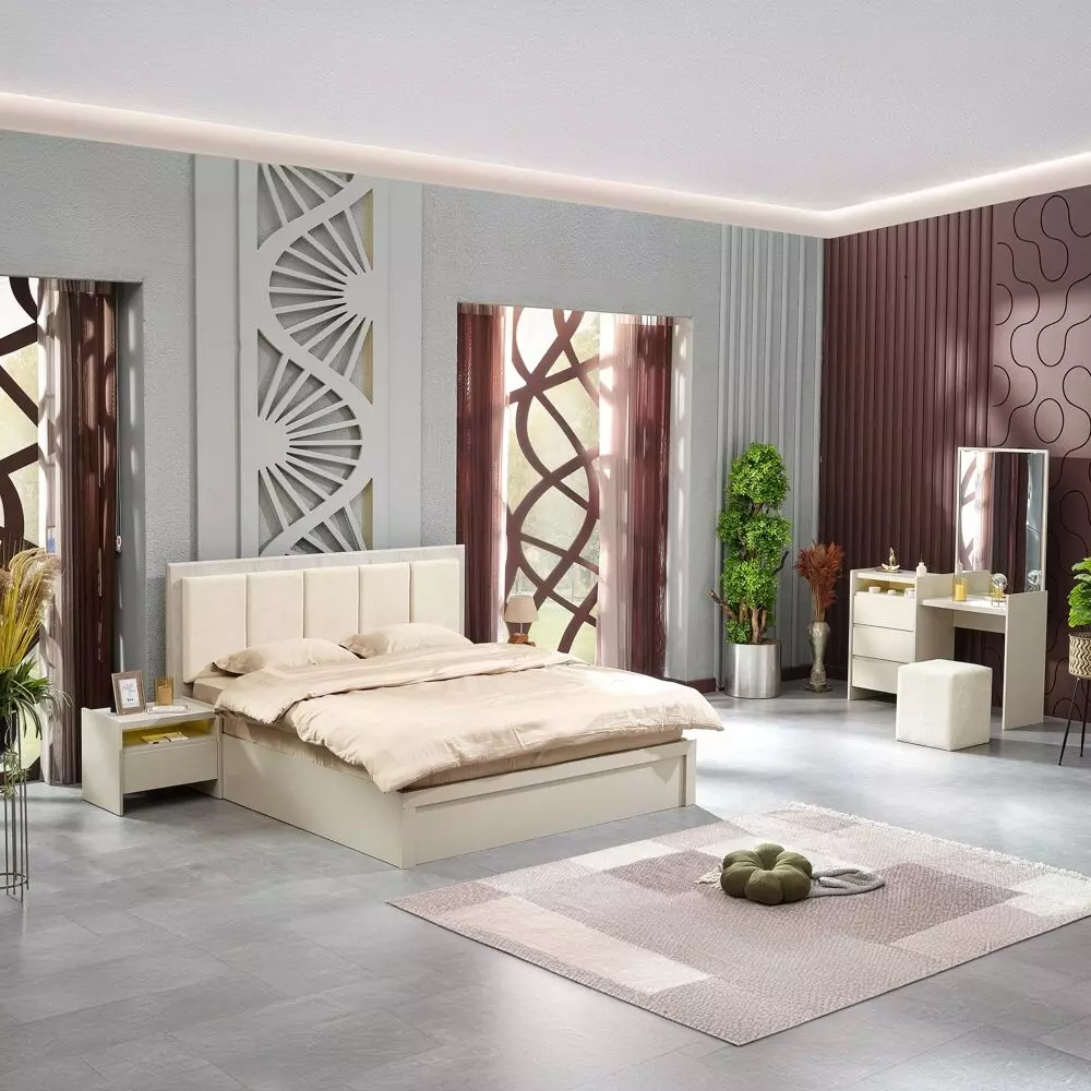 يتضمن الطقم 1 x سرير كينج - 2 x طاولة سرير جانبية - 1 x طاولة تزيين - 1 x مرآة - 1 x مقعد.