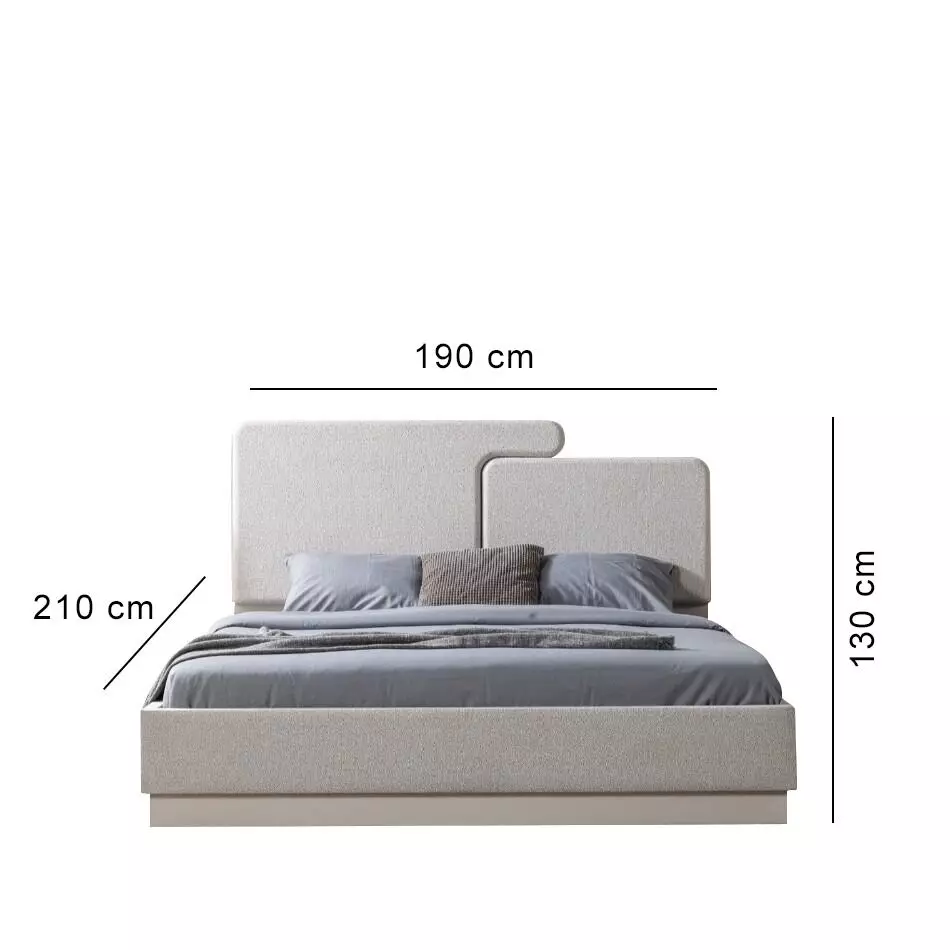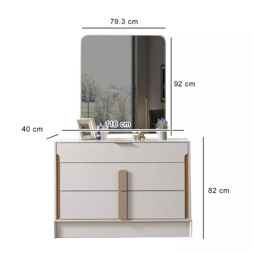 """مقاس السرير : الطول 210 - العرض 190 - الارتفاع 130 سم الكومدينو : العرض 44 - العمق 40 - الارتفاع 60 سم طاولة التزيين : العرض 116 - الارتفاع 82 - العمق 40 سم مقاس المرآة : العرض 79.3 - الارتفاع 92""" |