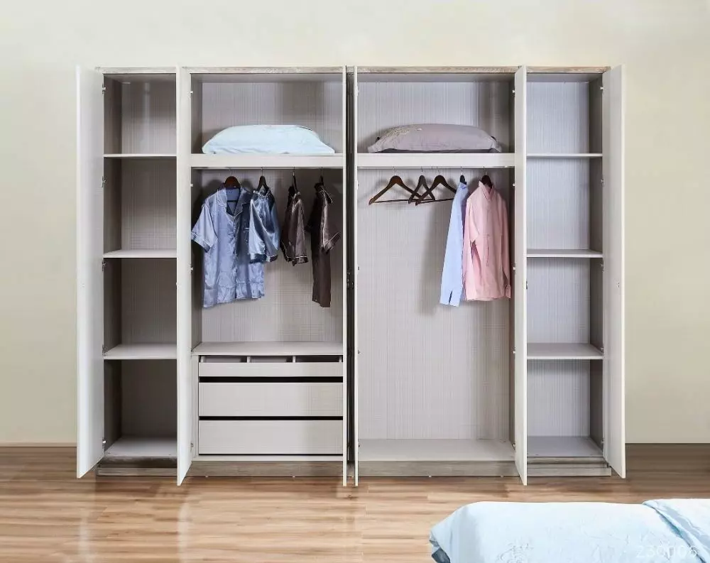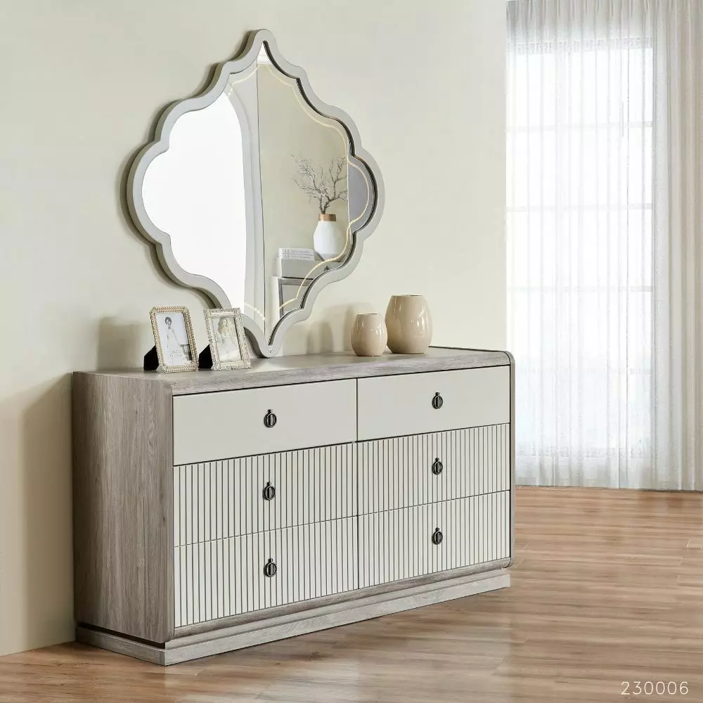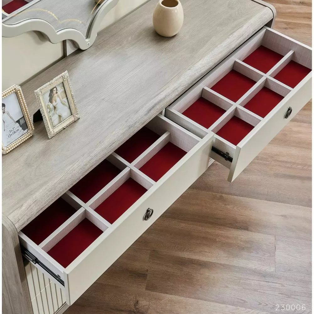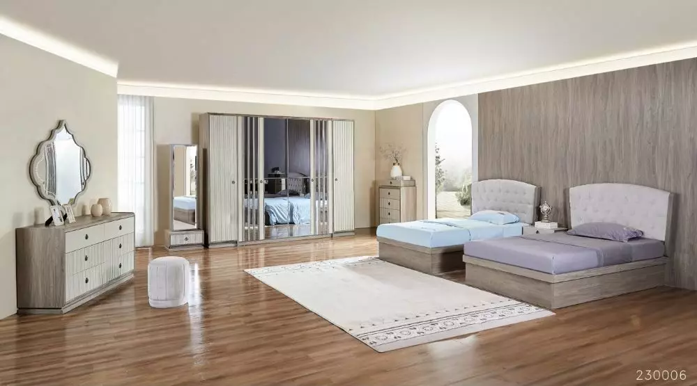 يتضمن الطقم 2 سرير مفرد - دولاب - طاولة تزيين ومرايا - كرسي طاولة تزيين - وحدة ادراج - مراة طويلة مع درج تخزين - 1 كومودينو