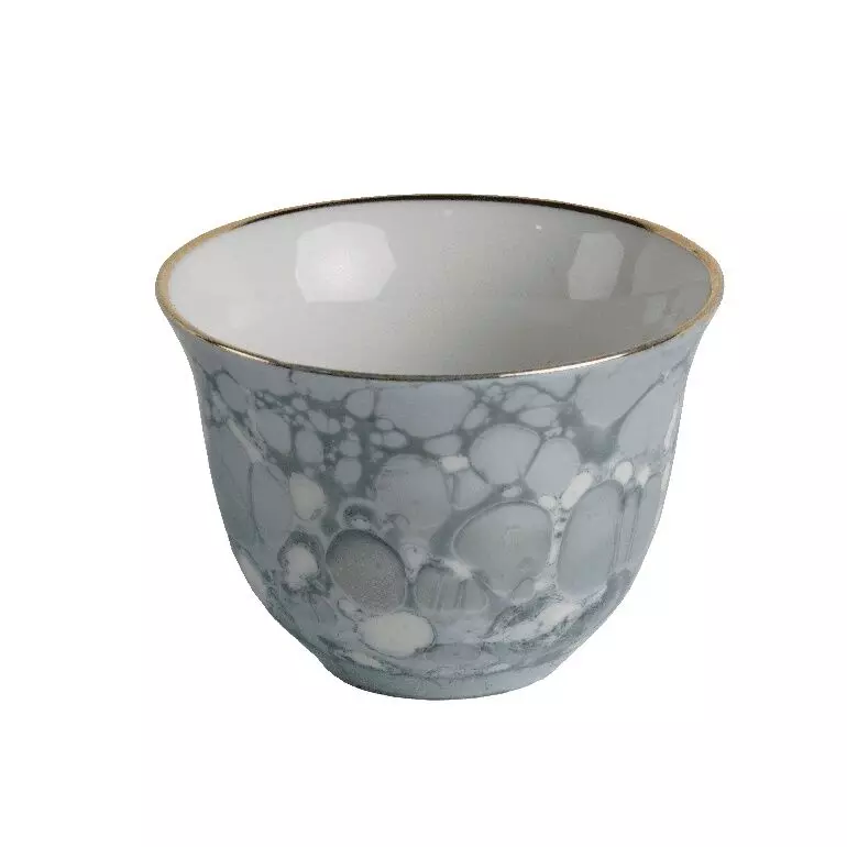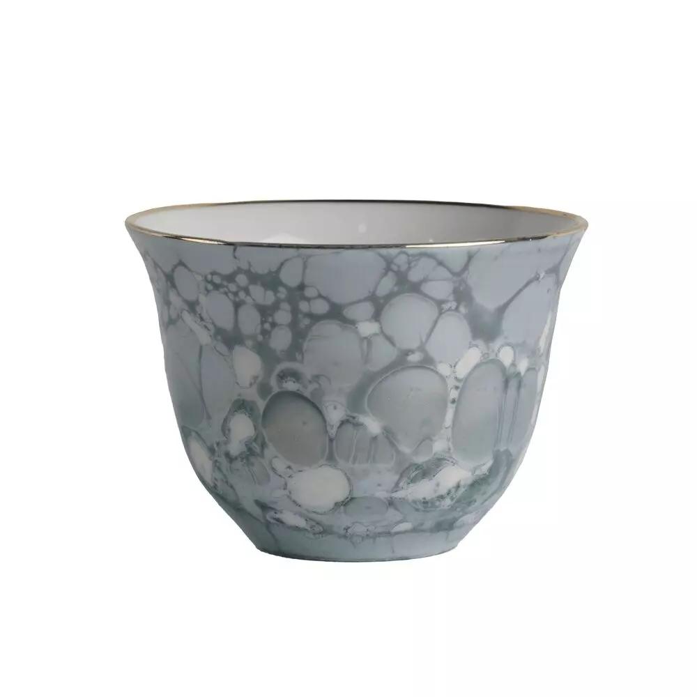 فناجين قهوة 6 قطع عربية مصنوعة من البورسلان باللون الرمادي مزينة بنقوش فضية, مثالية للإستخدام اليومي وللضيافة.