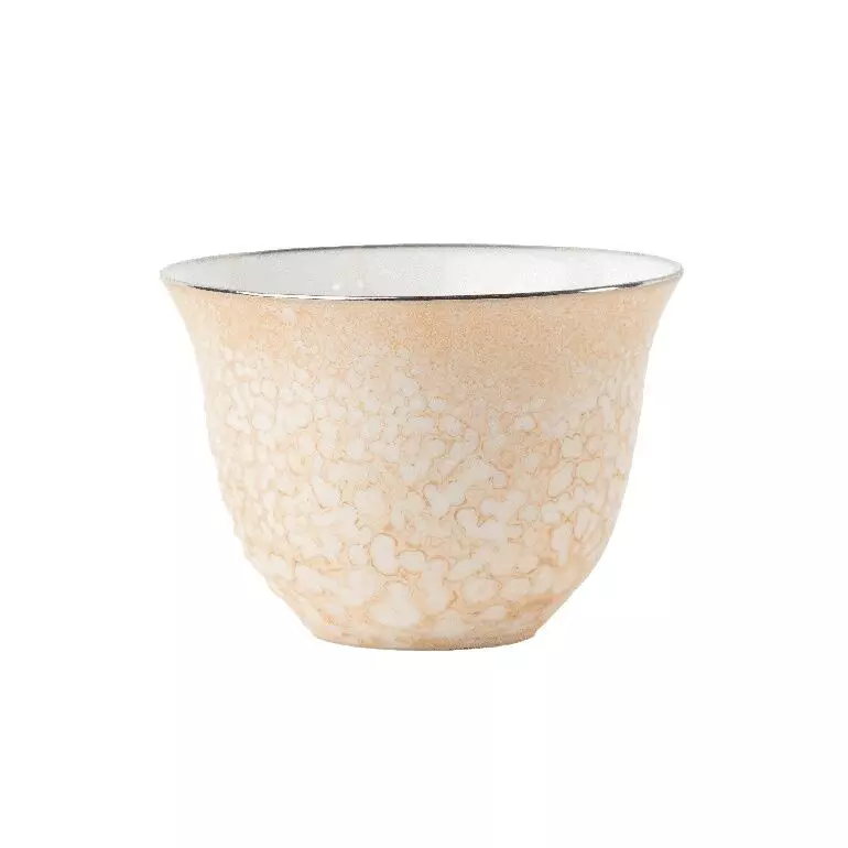 فناجين قهوة عربية 6 قطع مصنوعة من البورسلين باللون السكري مزينة بنقوش بيضاء, مثالية للإستخدام اليومي وللضيافة.