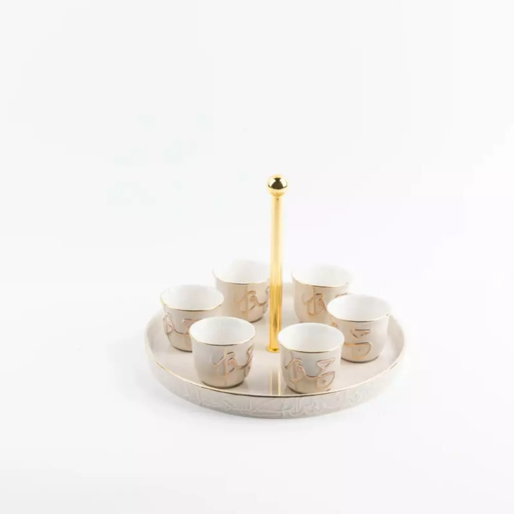 يتضمن الطقم 7 قطع تشمل فناجين القهوة العربية وستاند أنيق مزود بعصا معدن في الوسط لسهولة الحمل والتنقل وللمحافظة على الترتيب واللمسة الجمالية، حجم الفناجين مناسب لتقديم كوب من القهوة والاستمتاع بكل رشفة.