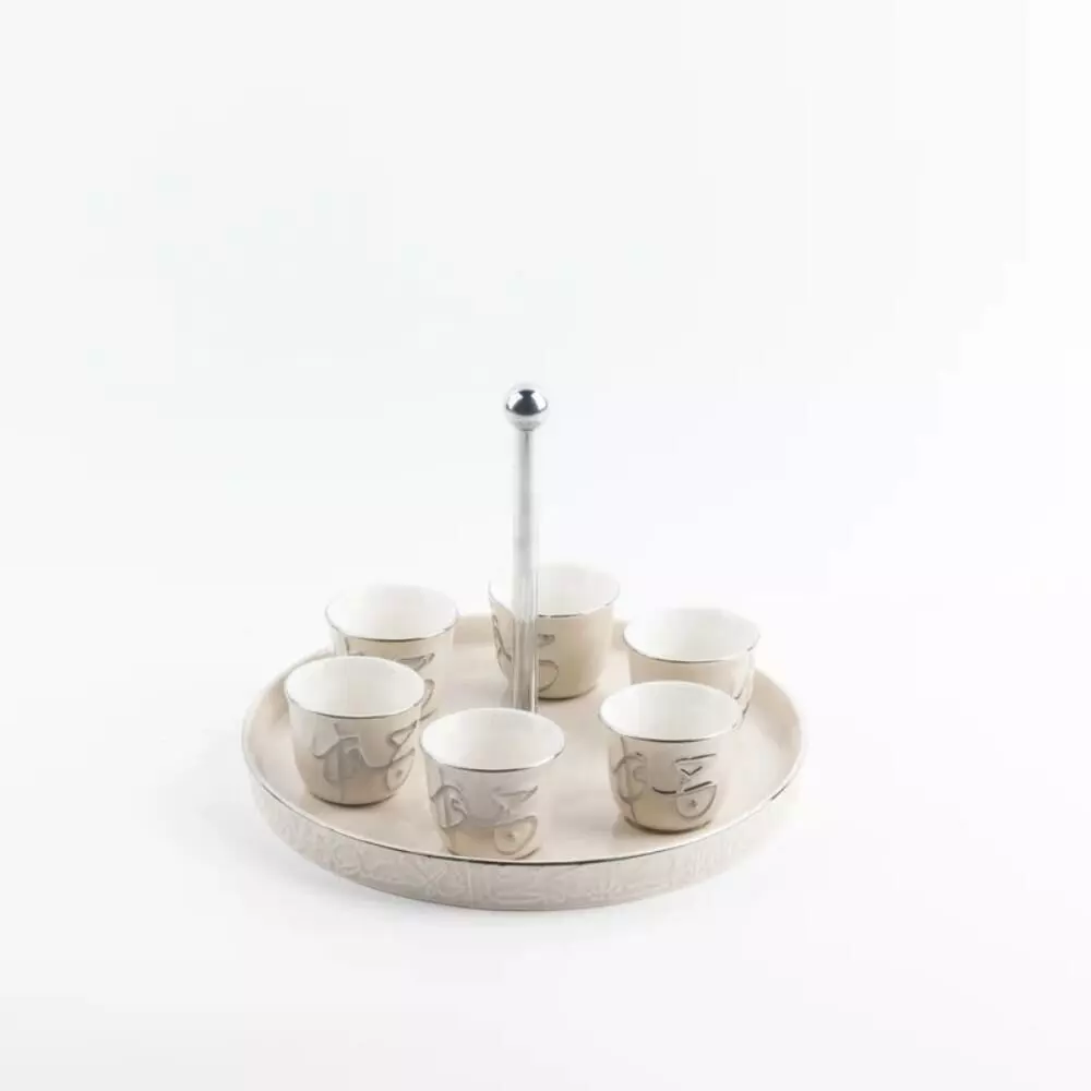 يتضمن الطقم 7 قطع تشمل فناجين القهوة العربية وستاند أنيق مزود بعصا معدن في الوسط لسهولة الحمل والتنقل وللمحافظة على الترتيب واللمسة الجمالية، حجم الفناجين مناسب لتقديم كوب من القهوة والاستمتاع بكل رشفة.