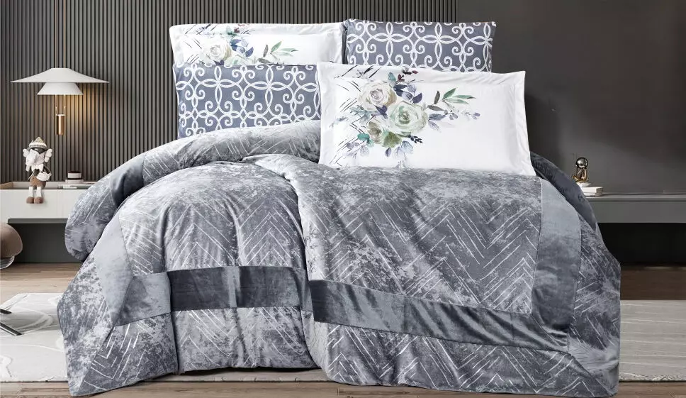 | يتضمن الطقم | 1 لحاف مزدوج + 1 غطاء سرير + 2 غطاء مخدة + 2 غطاء مخدة مع حواف |