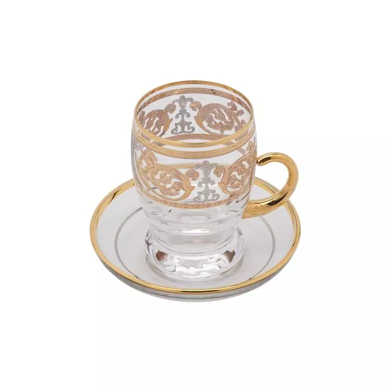 طقم من 6 فناجين شاي مصنوعة من الزجاج مزينة بنقوش ذهبية وفضية, مثالية للإستخدام اليومي أو للضيافة.