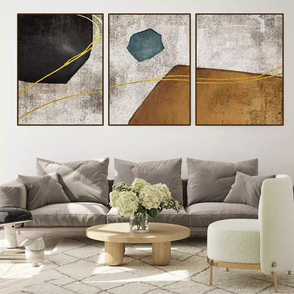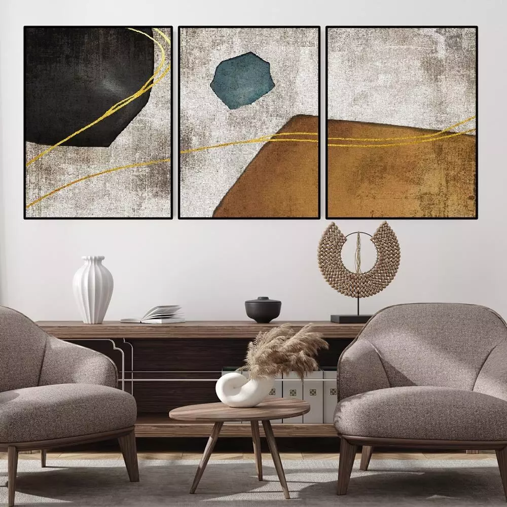 اللوحة الفنية المكونة من ثلاث قطع بتصميم تجريدي مميز، تتناسب بشكل مثالي مع الديكور العصري والراقي. الألوان الداكنة مع لمسات البيج تمنح المكان لمسة من الفخامة والهدوء، وتضفي على غرفة المعيشة إحساسًا بالتوازن والجمال.