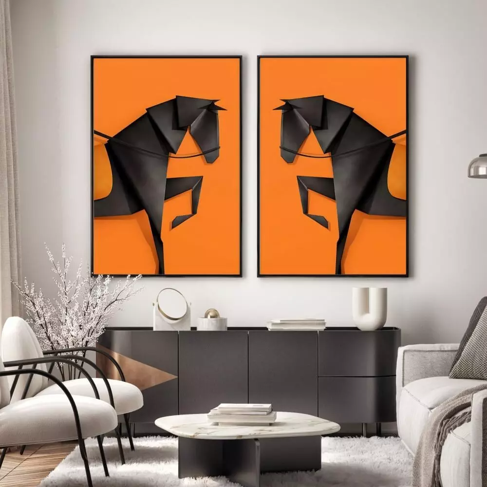 أضف لمسة جريئة وعصرية إلى مساحتك مع لوحة هورس أبستراكت المميزة! هذه اللوحة الجدارية بتصميمها الهندسي الأنيق تُظهر حصانًا أسود بتفاصيل فنية مقطعة على خلفية برتقالية زاهية. مثالية لعشاق الفن الحديث والألوان الجريئة، حيث تمنح الحائط جاذبية مميزة وحضورًا قويًا. تمزج بين الفن التجريدي والطبيعة بطريقة مبتكرة، مما يجعلها قطعة مثالية لأي ديكور معاصر. التفاصيل: