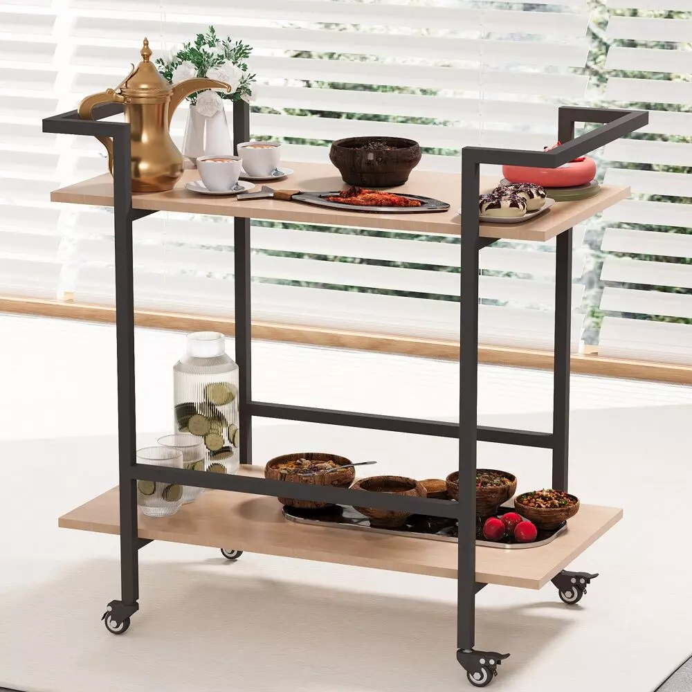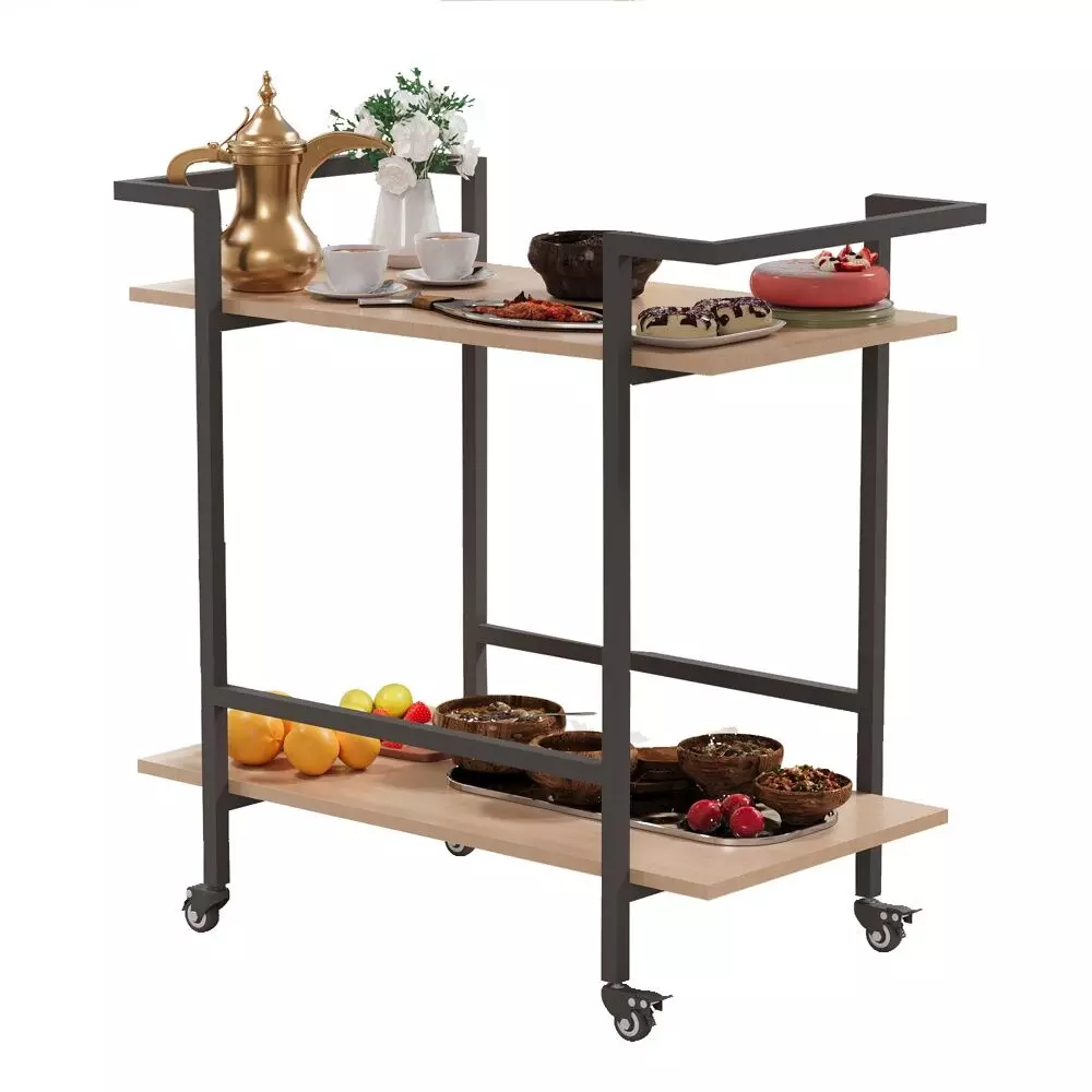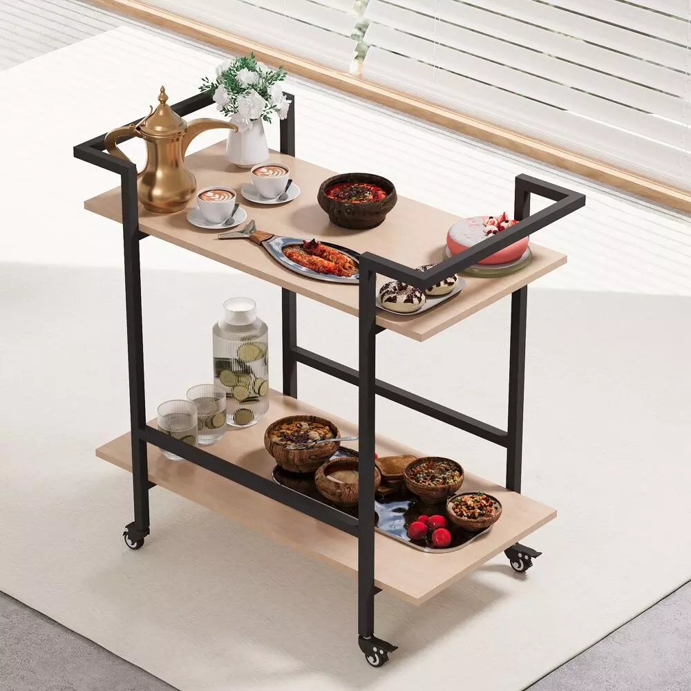 عربة بعجلات مزودة برفين مفتوحين واسعين توفر مساحة تخزين واسعة للأكواب والفواكه والوجبات الخفيفة وأدوات المائدة ودلاء الثلج.