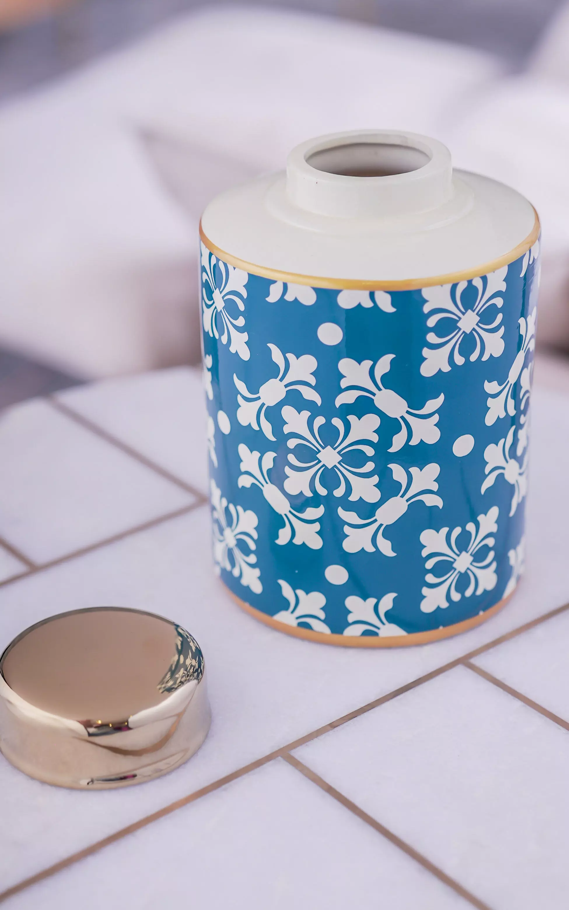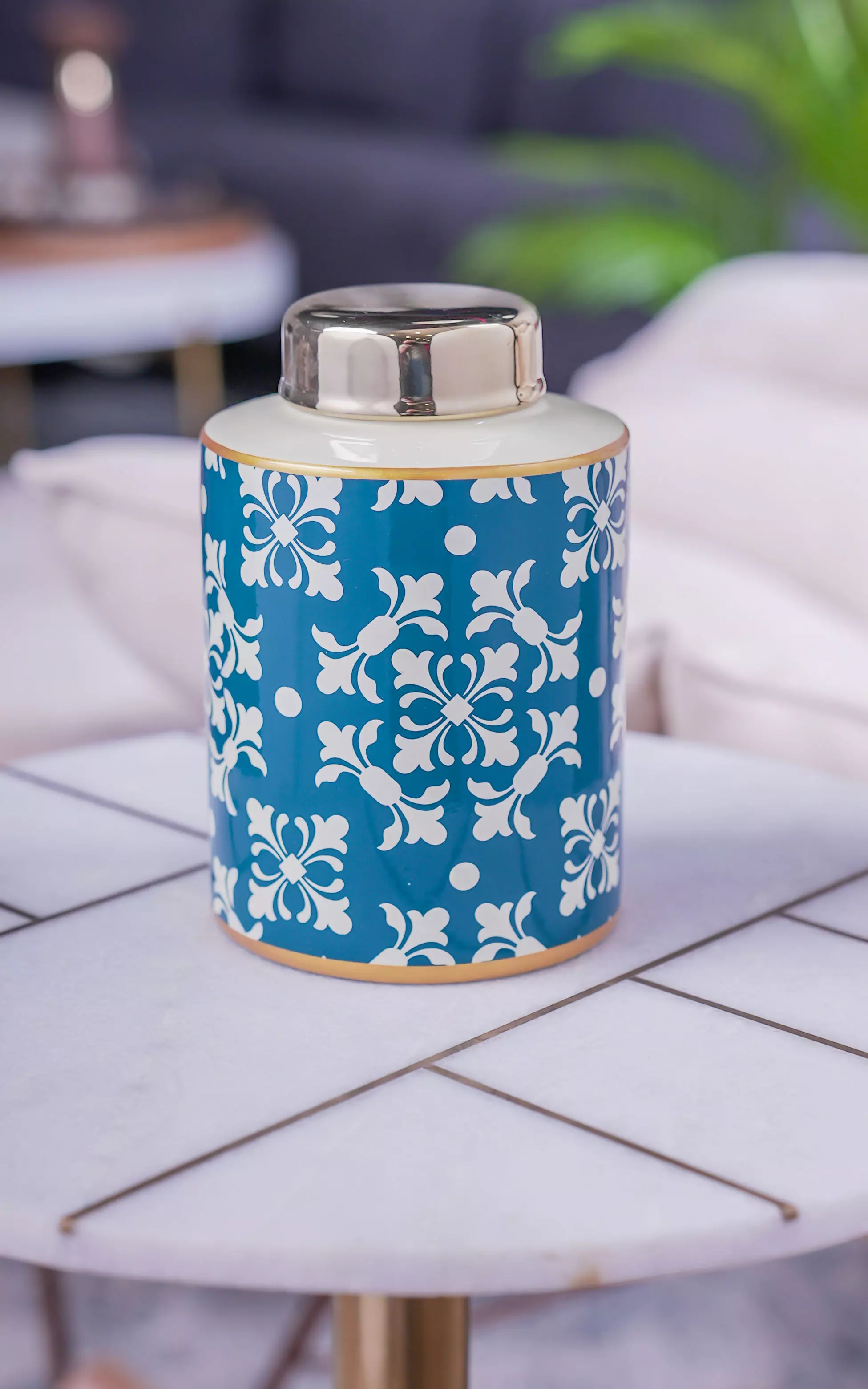 فازة أنيقة وبتصميم عصري وبألوان هادئة مميزة تضفي على الديكور جمال مميز ولمسة فريدة يمكنك استخدامها بمفردها كاكسسوار منزلي أو إضافة الزهور إليها لتزيدها جمال أو لحفظ بعض المقتنيات كونها مزودة بغطاء. مصنوعة من السيراميك عالي الجودة ومطلية بألوان ثابتة مع الزمن ومقاومة للعوامل الجوية المختلفة.