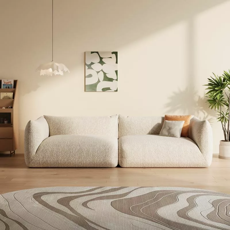 الكنب مكون من 3 طبقات من الإسفنج: إسفنج عالي الكثافة 45D بسمك 9 سم + إسفنج متوسط الكثافة 35D بسمك 5 سم + إسفنج منخفض الكثافة 30D بسمك 3 سم حشوة الظهر مصنوعة من إسفنج متوسط الكثافة 35D لون القماش : أبيض بيج (دوائر بيضاء محبوكة على قماش بيج فاتح لامع ) الملمس : ملمس قوي قليلاً . |