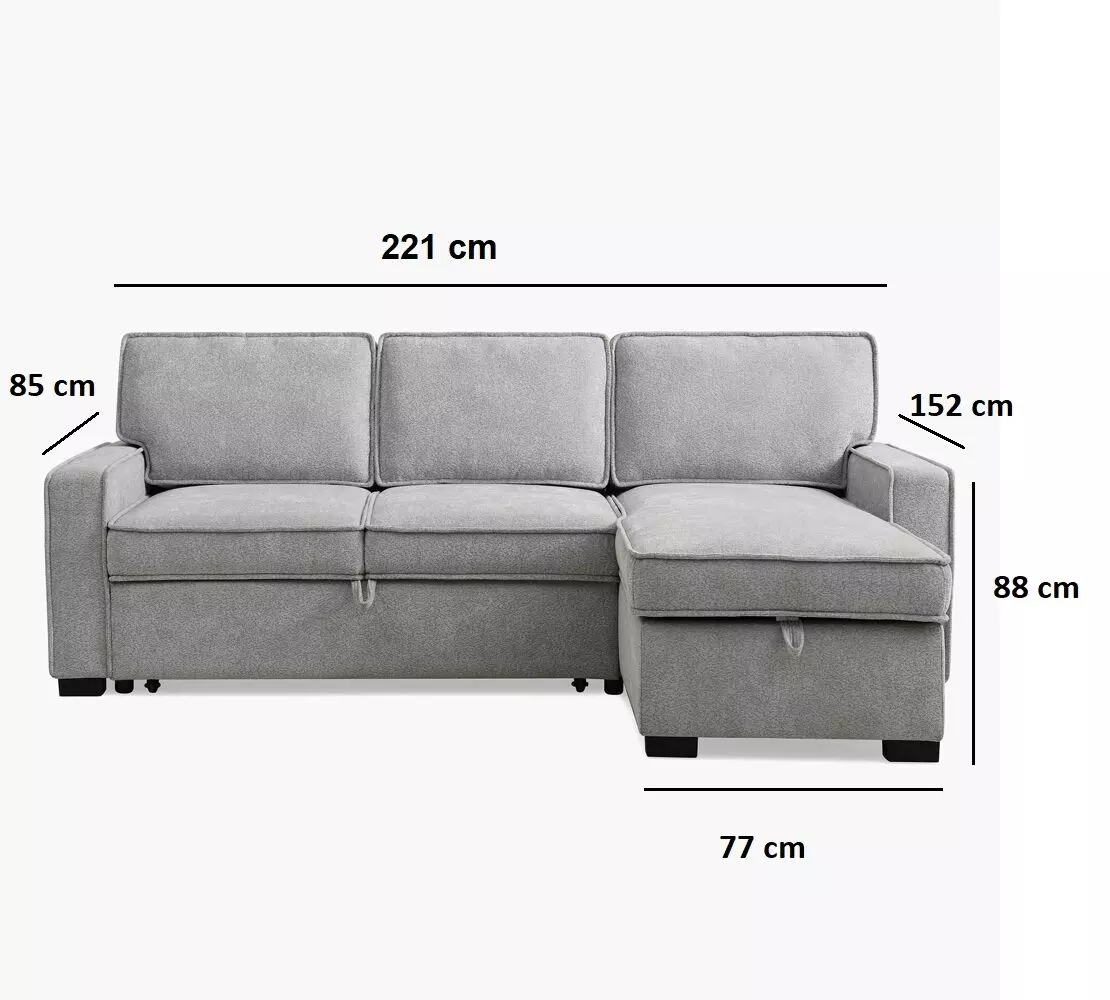 | مقاسات المنتج | مقاس كنبة الزاوية , العمق: 85 سم , الارتفاع: 88 سم , العرض: 221 سم , مقاس أريكة الاسترخاء , العمق: 152 سم الارتفاع: 88 سم x العرض: 77 سم |