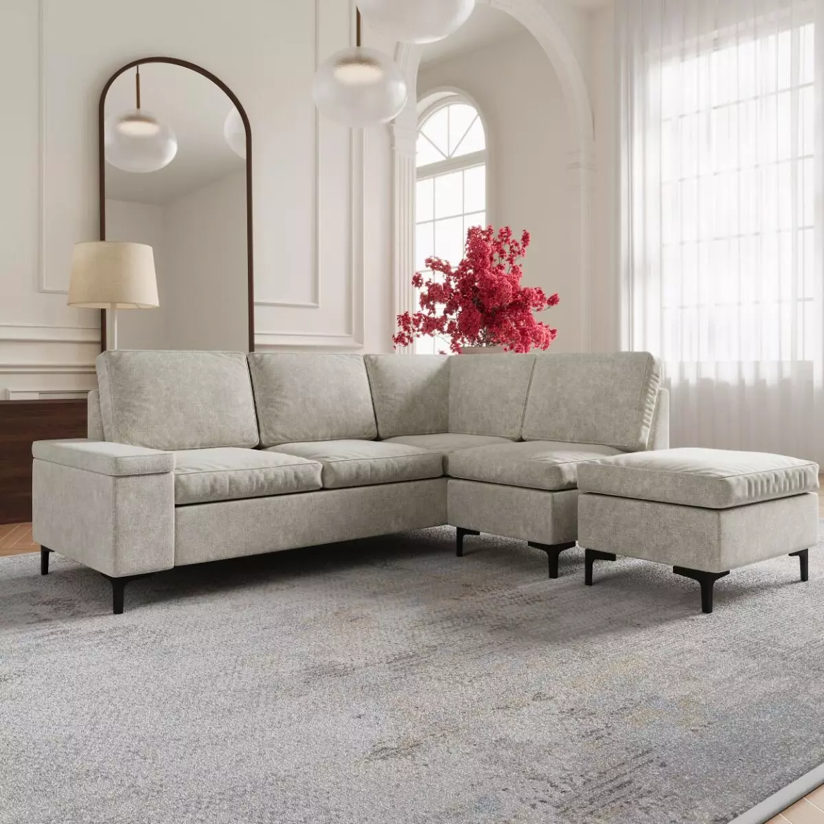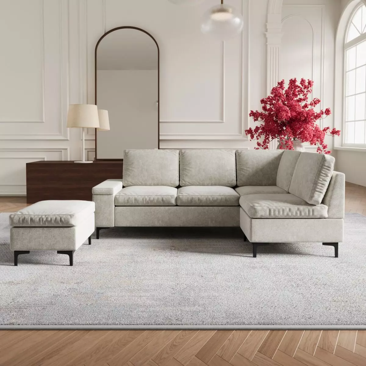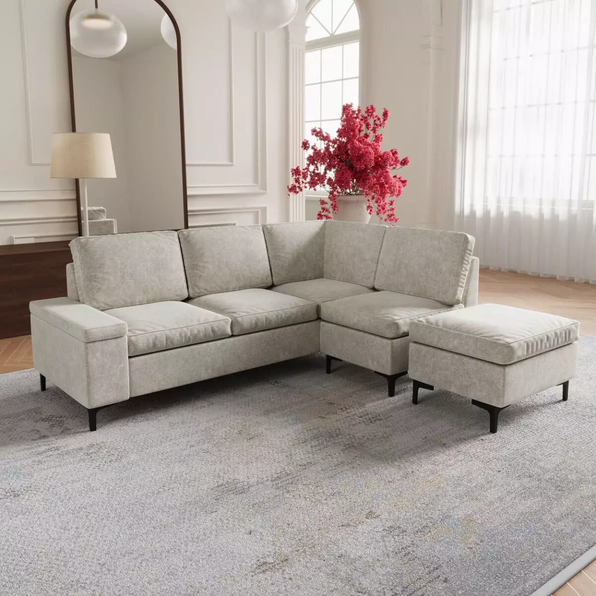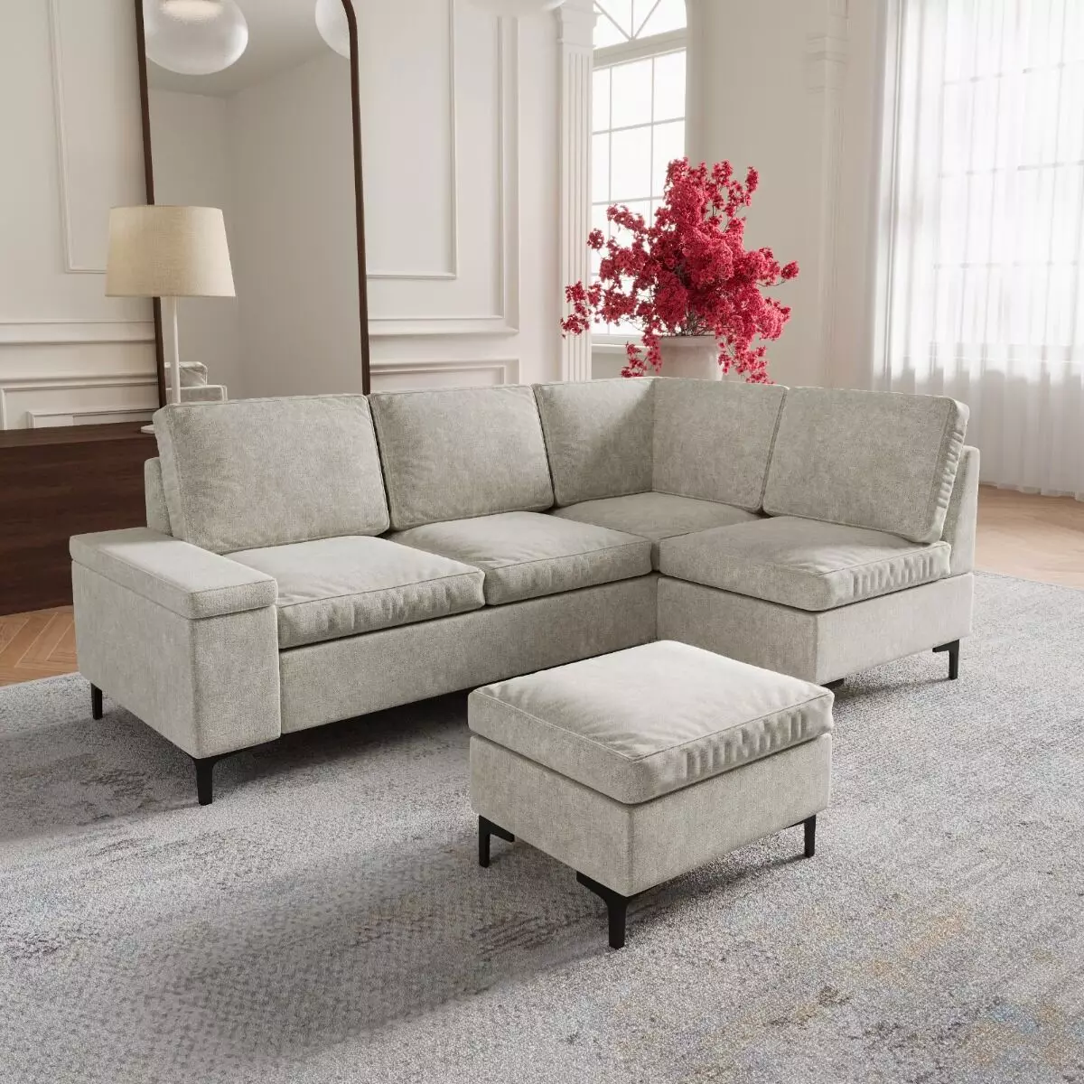 | يتضمن الطقم | 1 كنبة ثنائية يد يمين -1 كنبة زاوية مفردة - 1 كنبة مفردة بدون ذراعين -1 مقعد بف |
