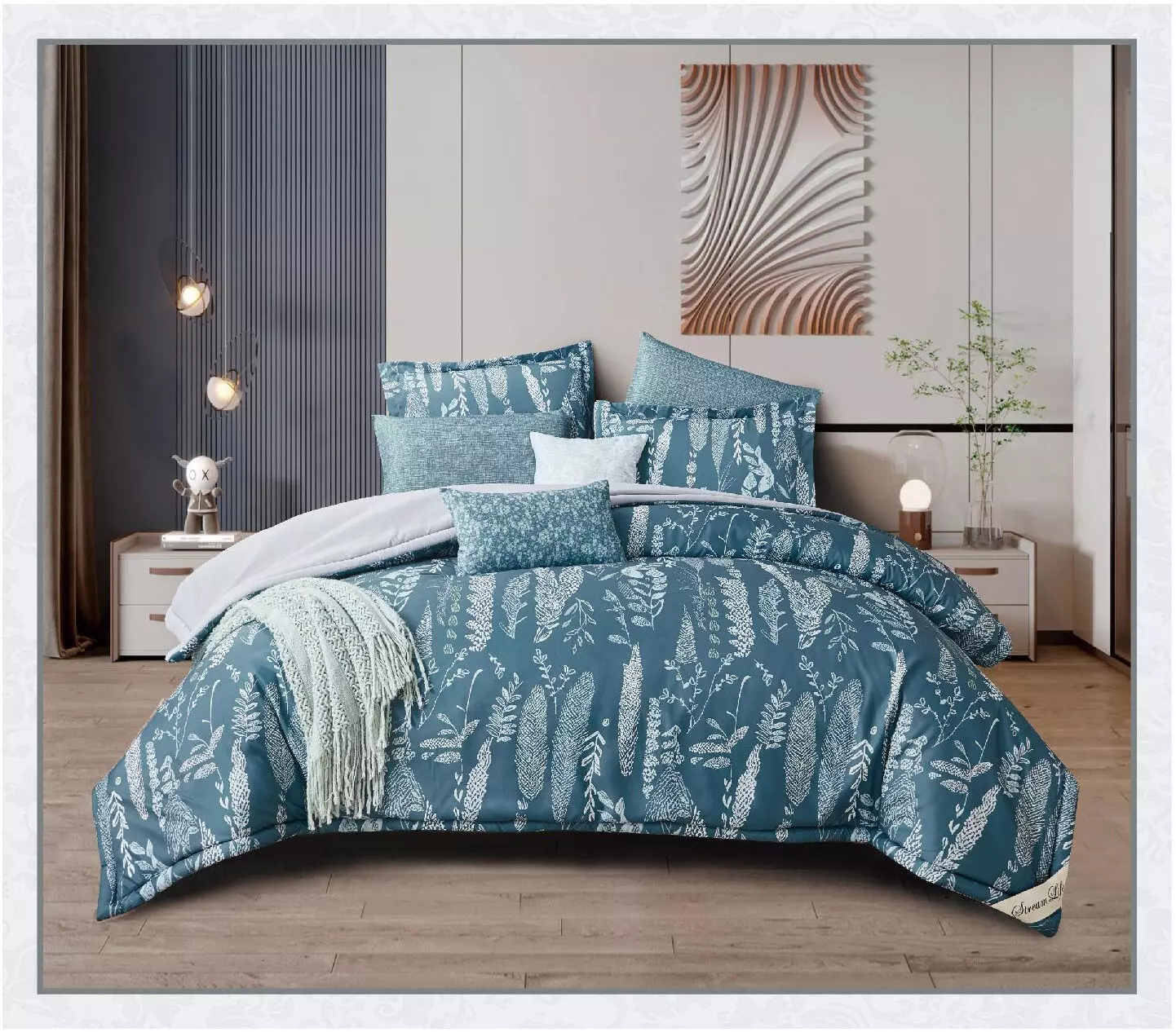 طقم لحاف كينغ استريم لايف يعطي أناقة للأسرة والراحة والدفء خلال النوم تعتبر أساسية في كل منزل لذلك نوفر لك أجمل طقوم اللحاف بتصاميم ونقشات متنوعة وجذابة وخامات عالية الجودة. تصميم مميز وخامات عالية الجودة يشكل إضافة رائعة لأطقم اللحافات الخاصة بك. وسادة نوم: عدد القطع : 4, 2 غطاء وسادة نوم مع حواف , المقاس: الطول 50 x العرض 75+5 سم - 2 غطاء وسادة نوم بدون حواف , المقاس : الطول 50 x العرض 75 سم شرشف سرير: عدد القطع: 1 , المقاس:200 × 200 + 38 غطاء خدادية: وسادة خدادية المقاس 45 × 45 - وسادة الديكور المقاس 30 × 50