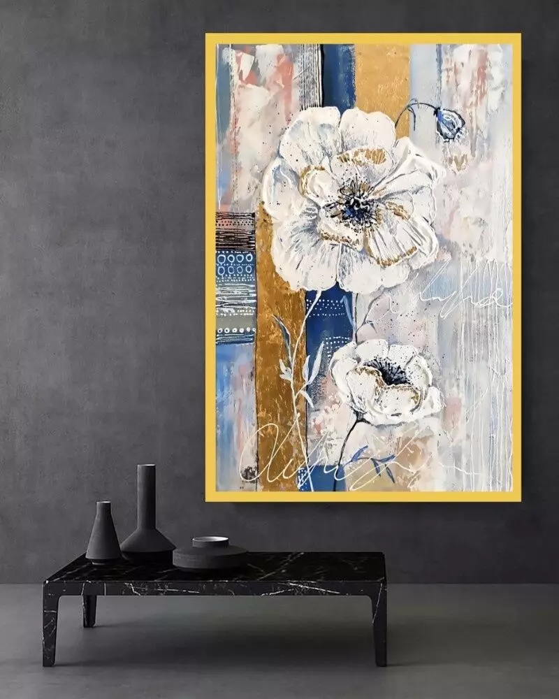 لوحة من الفن التجريدي الحديث، مزيج من ألوان مشرقة بالأزرق والبيج بطابع تصميم الورود المميزة.
