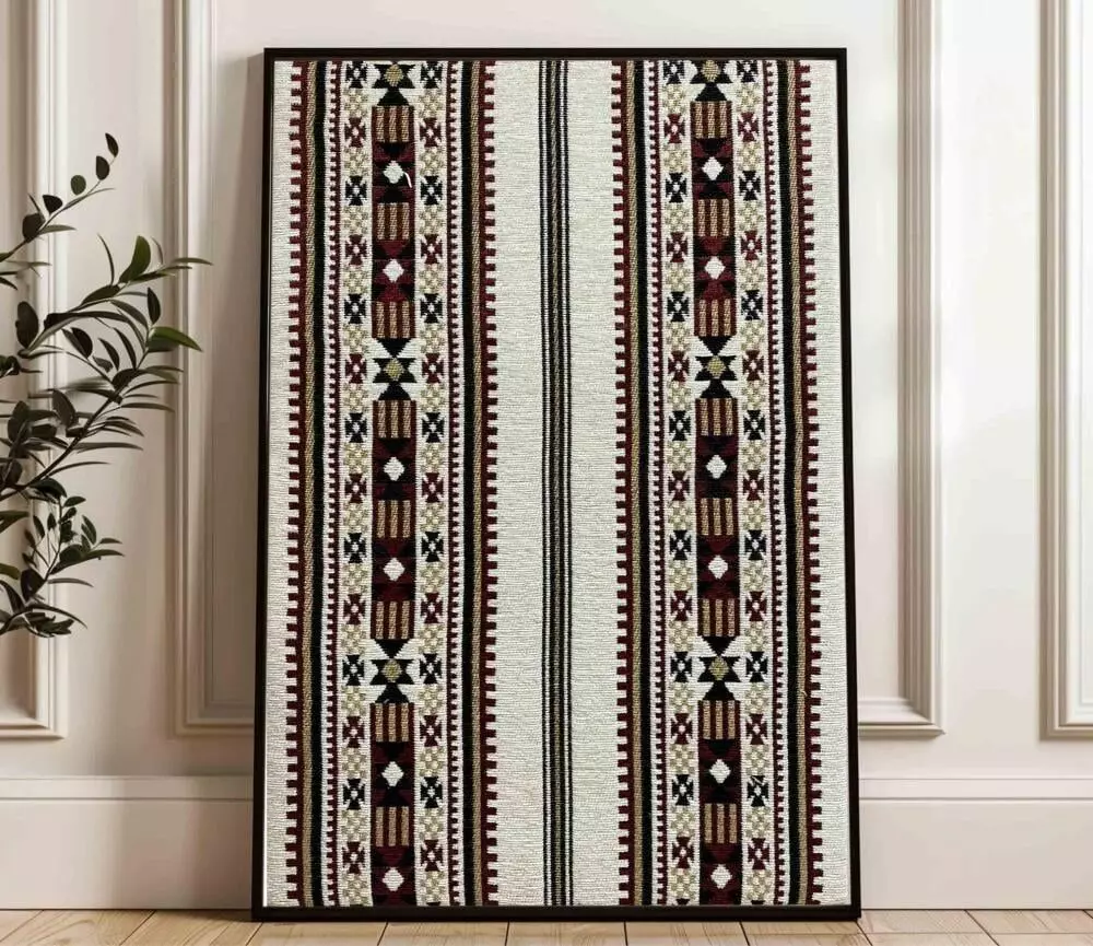 الألوان المستخدمة تتنوع بين الأبيض، الأسود، الأحمر، والذهبي، مما يضفي لمسة من الفخامة والتناسق على التصميم. وصف المنتج: لوحة جدارية بتصميم السدو التقليدي