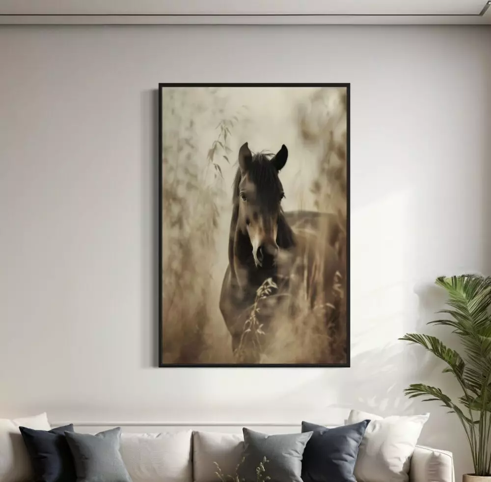 • لوحة جدارية ، نمط خيول ، لخيل اسود جامح بخلفية فنية مميزة اللوحة مناسبة كعمل فني يعطي جمالا لديكورات المنزل