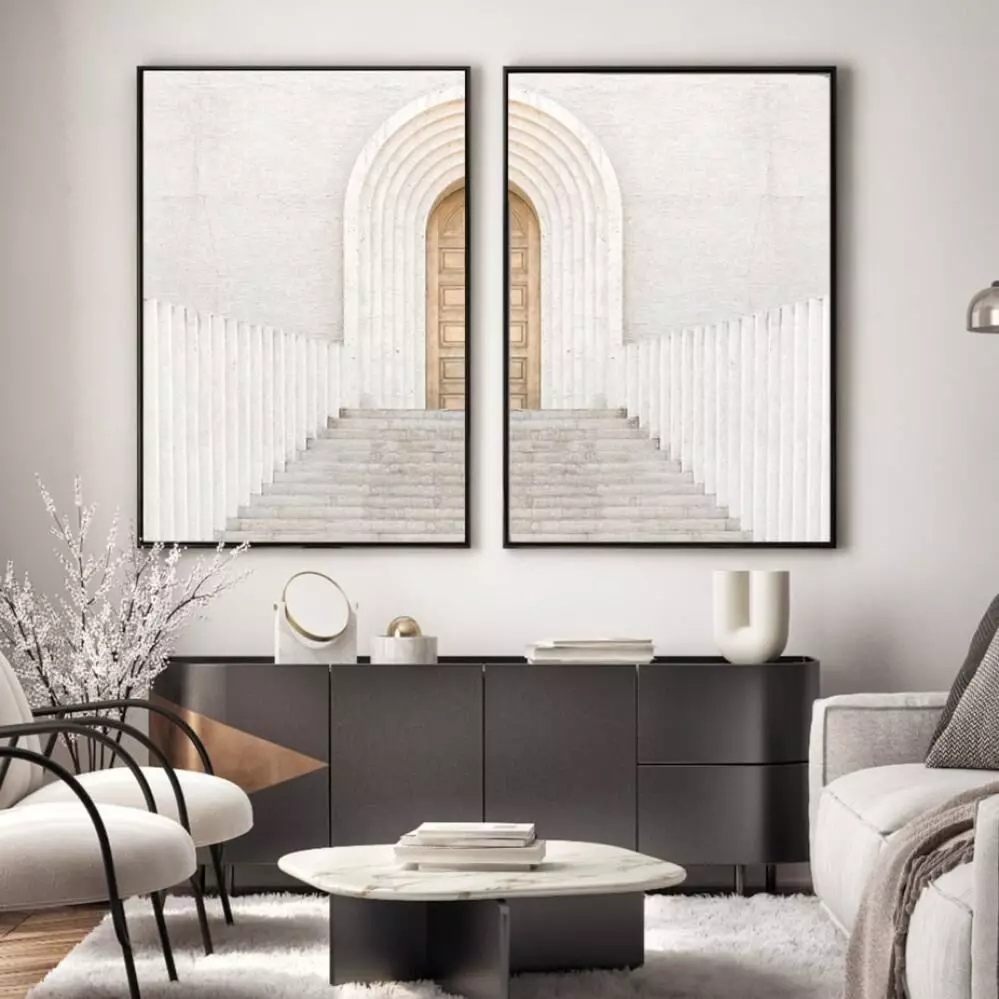 لوحة جدارية ثنائية تحفة فنية معمارية تعكس التوازن المثالي بين الفخامة والبساطة. تتميز بتصميم هندسي أنيق يظهر مدخلاً مقوسًا محاطًا بدرج متماثل، ما يضفي على العمل إحساسًا بالعظمة والعمق البصري. تم تصميم اللوحتين بأسلوب فني معاصر يعتمد على الألوان المحايدة بين البيج الفاتح والأبيض، مما يجعلها قطعة ديكور قابلة للاندماج بسلاسة في أي نمط داخلي. المواصفات: