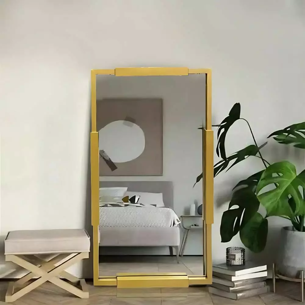 مرايا مستطيلة بإطار ذهبي وسطح زجاجي عاكس هي قطعة ديكورية فاخرة وجميلة تضيف لمسة من الفخامة والأناقة على المكان. التصميم المستطيلي يمنح الأجواء شعورًا بالانسيابية والنعومة، في حين يضفي لون الإطار الذهبي لمسة من الرقي والجمال على المرايا.
