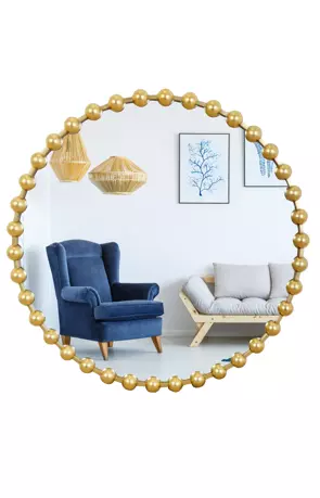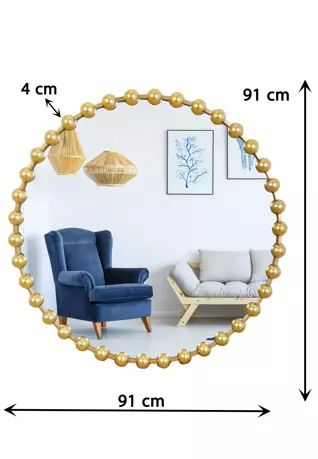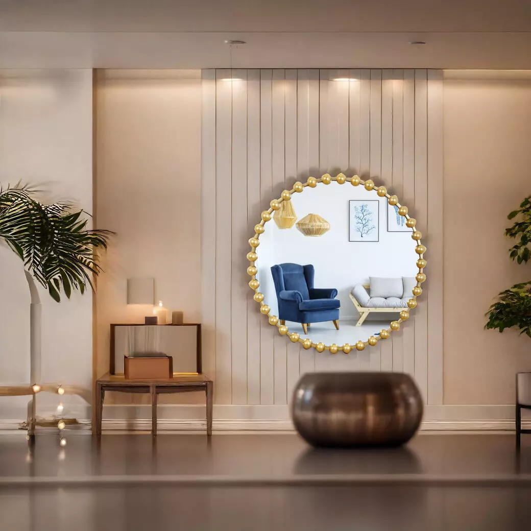 مرآة حائط دائرية ديكور جانبي بإطار حديد لون ذهبي مع تفاصيل مميزة تجمع بين التصميم العصري والجودة العالية لإضفاء لمسة أنيقة على المساحة المعيشية في منزلك.
