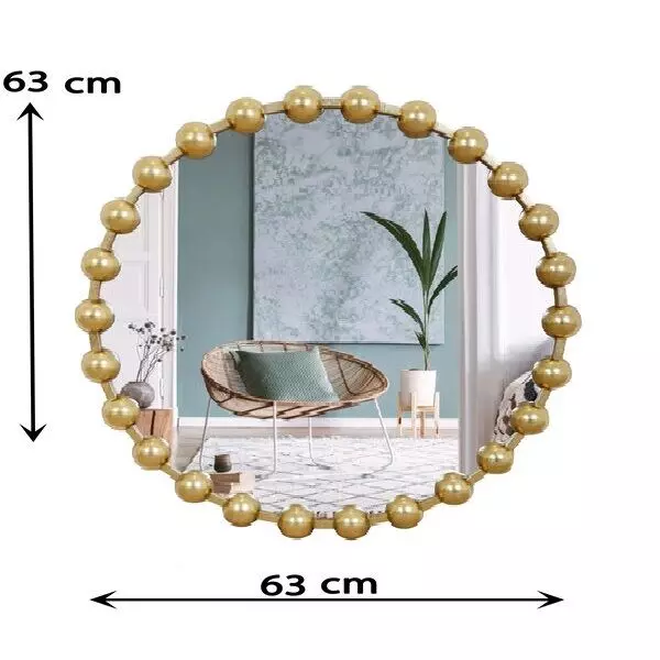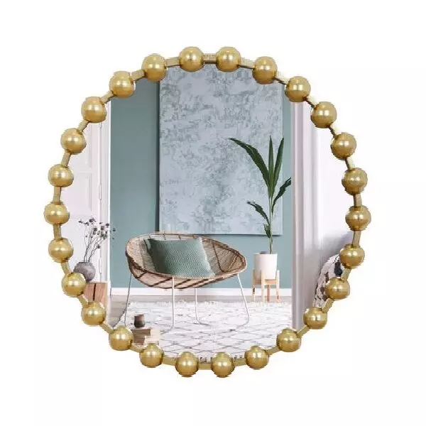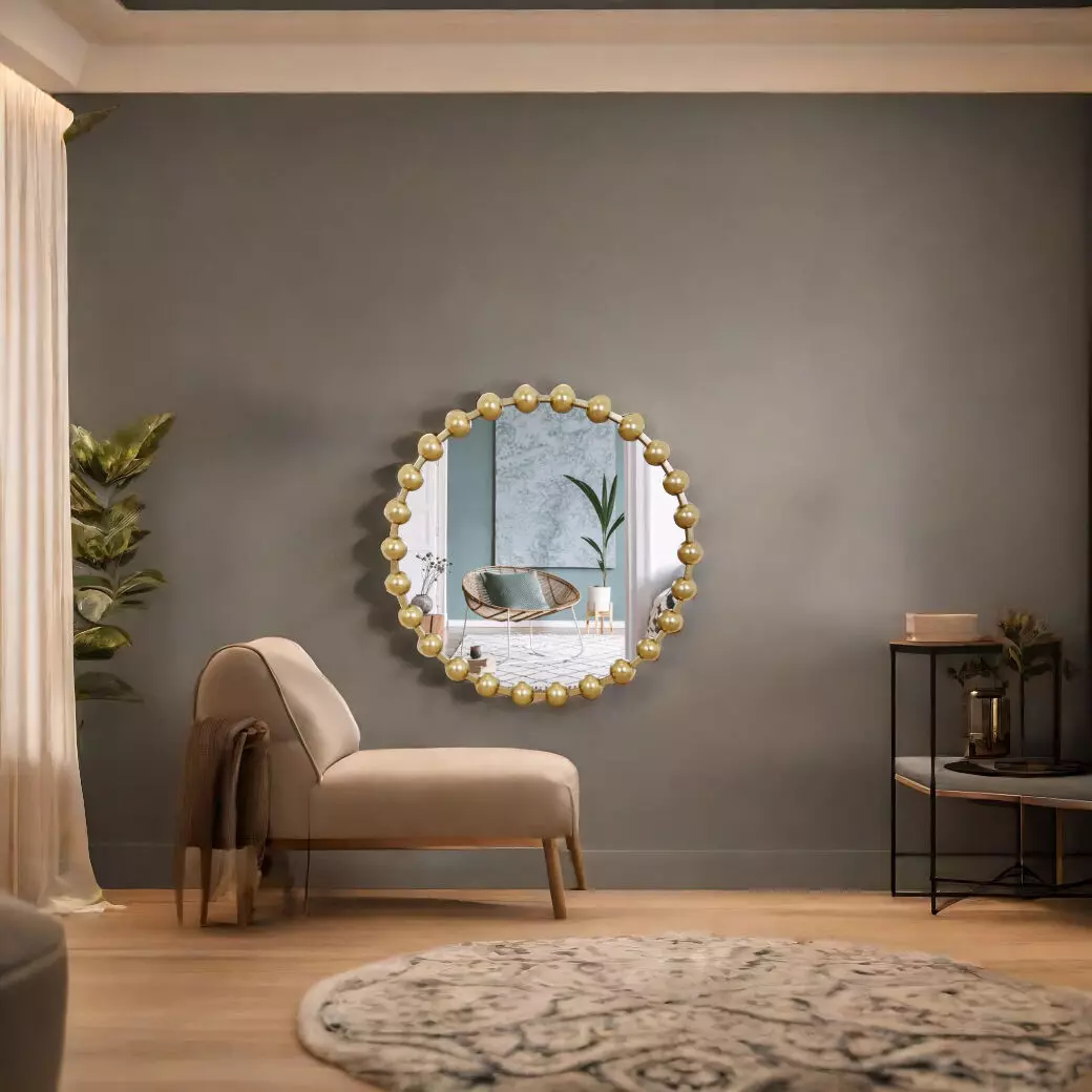 مرآة حائط دائرية ديكور جانبي بإطار حديد لون ذهبي مع تفاصيل مميزة تجمع بين التصميم العصري والجودة العالية لإضفاء لمسة أنيقة على المساحة المعيشية في منزلك.
