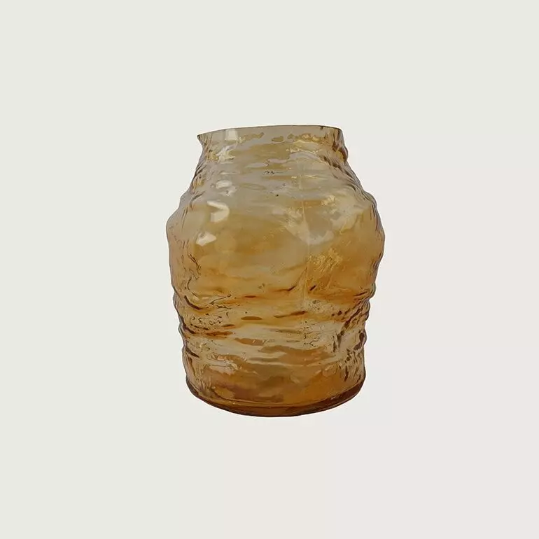 مزهرية إبداعية مصنوعة من الزجاج باللون البرتقالي, تتميز بتصميمها المميز الذي يجذب الإنتباه ويضيف جمالًا على الديكور, تستخدم في تنسيق المساحات الداخلية.